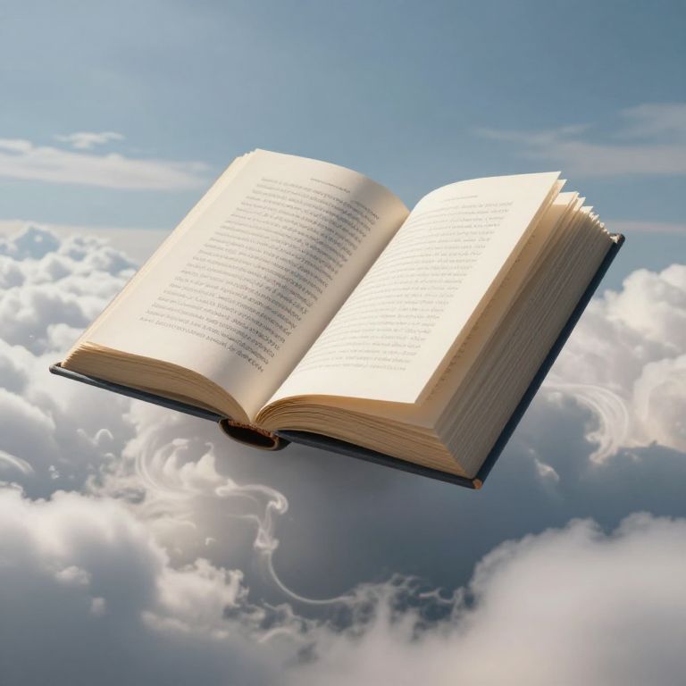 A colossal open book floats serenely amidst billowing clouds, its pages alive with stories that seem to ripple and breathe, defying gravity and inviting the imagination to soar.