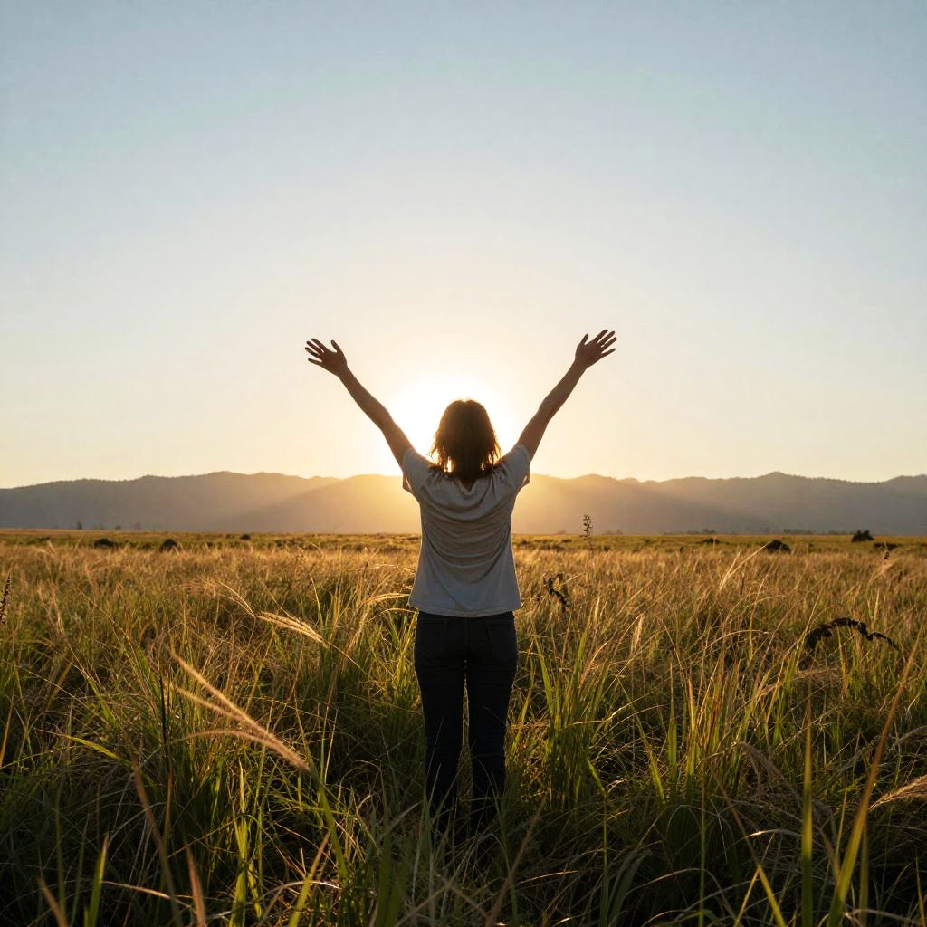 A person standing in a tall grassy field at sunset with arms raised, backlit by warm golden sunlight, surrounded by distant mountains under a clear sky, peaceful and uplifting mood