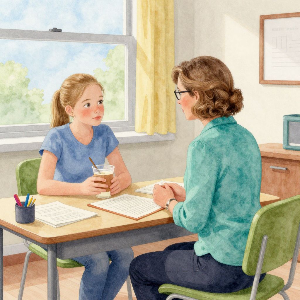 In this watercolor illustration, a mature school psychologist woman, dressed in a teal shirt, is engaged in a conversation with a 16-year-old girl at a desk in a therapy room at school. The girl, with blonde hair tied back, is seated in a green chair, holding a cup with a spoon, and looking attentively at the psychologist. The desk is cluttered with an open book and various papers, suggesting a discussion or therapy session. The room is softly lit, with a window in the background featuring a blue and green color scheme, and curtains that add a touch of warmth to the setting. The overall composition is balanced, with the two figures positioned centrally, creating a sense of intimacy and focus on their interaction.