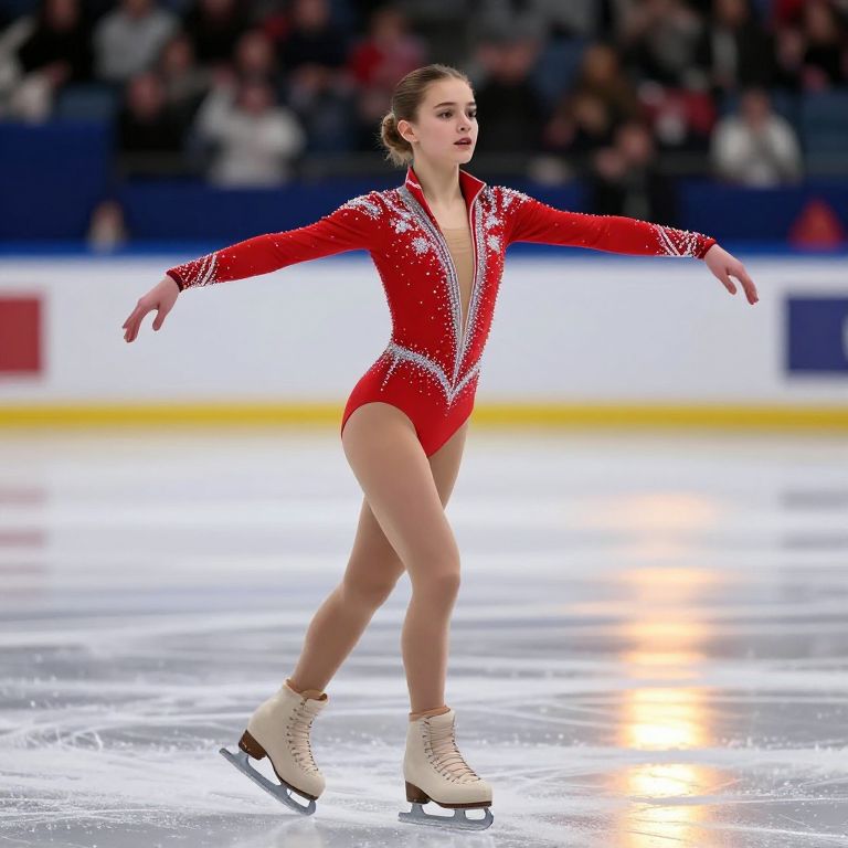 A realistic photograph of a young female figure skater in a vibrant, detailed figure skating outfit with bright red and silver accents, showcasing full-length skates, a sleek bodysuit, and a fitted jacket with snowflake patterns, standing confidently on a frozen ice rink at dusk, with soft golden light reflecting off the ice and the background showing a blurred view of cheering fans in the stands, realistic skin texture, natural facial expression with clear eyes and determined gaze, close-up focus on the outfit and the motion of her arms as she performs a pose.