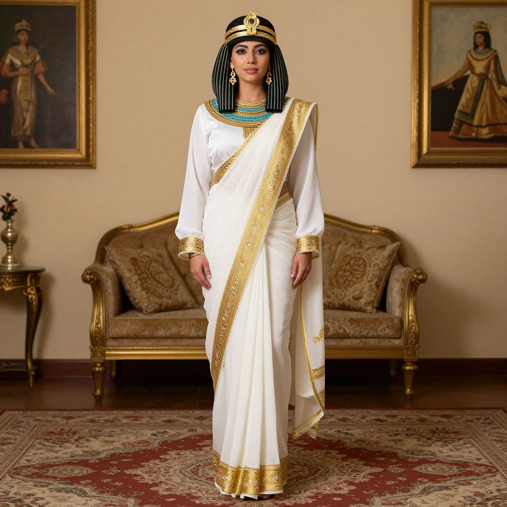 Photograph of a woman in an Egyptian-style white dress with gold trim, black striped headdress, and turquoise necklace, standing in an elegant room with