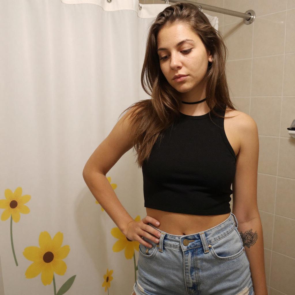 Photograph of a young woman with long brown hair, wearing a black sleeveless crop top with white , light blue denim shorts, and a black choker necklace. She has a tattoo on her left forearm and stands in a bathroom with beige tiled walls and a white shower curtain with yellow flowers. Her right hand rests on her hip, and she gazes slightly downward with a neutral expression.