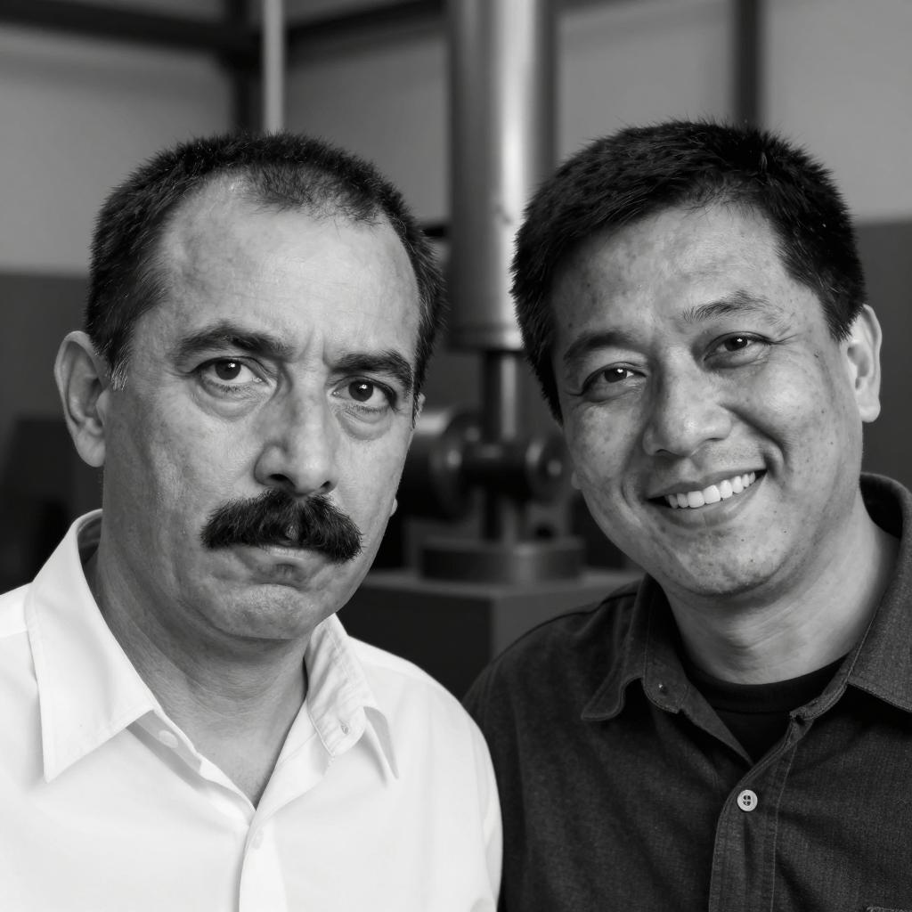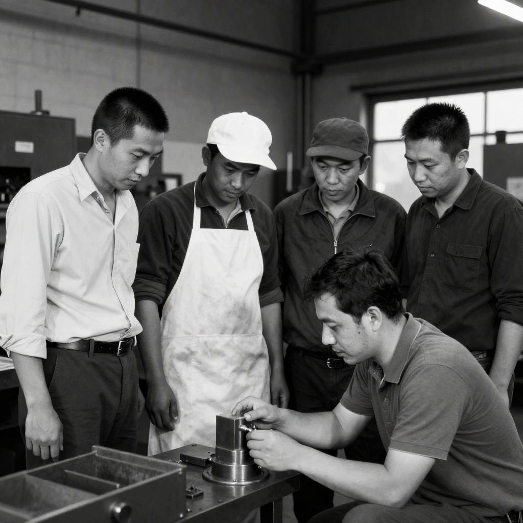 Black-and-white image of five Asian men in a factory workshop. Four men stand closely together while one kneels and examines a metal object on a workbench. The man kneeling wears a polo shirt, one standing man wears a light button-up shirt, another wears a white cap and apron, the third a dark jacket and cap, and the fourth a dark shirt. The background shows industrial equipment and a window with natural light. All men appear focused and concentrated on the task.