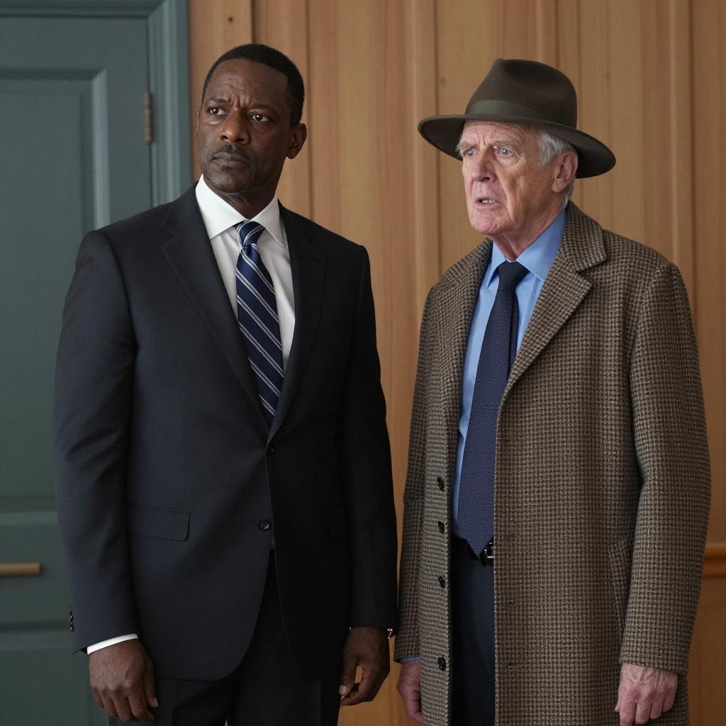 Two middle-aged Caucasian men standing indoors against a cracked, faded wall. The man on the left has curly gray hair, visible facial wrinkles, and is wearing a brown corduroy jacket over a dark shirt, shown in side profile. The man on the right has blond hair, a thick mustache, and is dressed in a black suit jacket with a brown button-up shirt, facing slightly to the right. Both men have serious and intense expressions.
