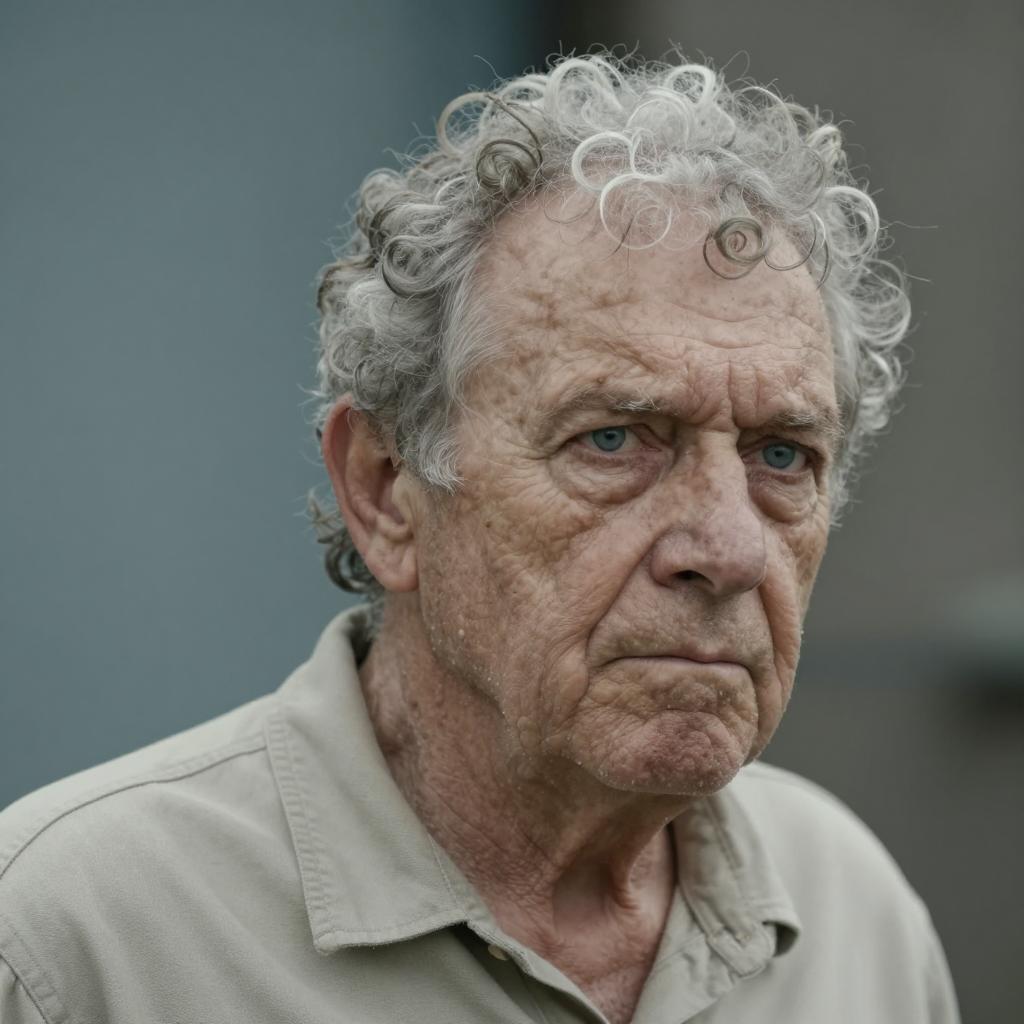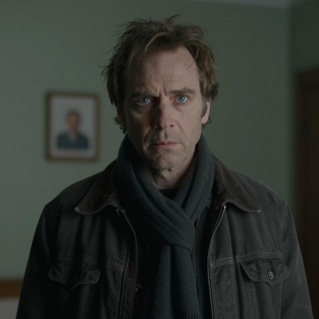 Two middle-aged men in a dimly lit room. Left man has curly gray hair, visible wrinkles, brown corduroy jacket, side profile. Right man has blond hair, mustache, black suit jacket, brown shirt, facing slightly right. Cracked, ured wall in background. Both men have intense expressions.