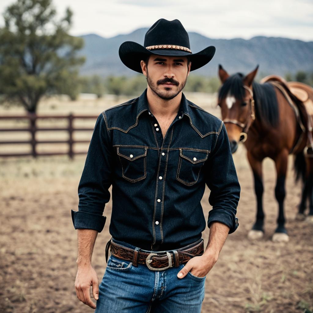 Modern cowboy attire male,1boy, male focus, cowboy hat, hat, solo, cowboy western, shirt, belt, outdoors, facial hair, pants, brown belt, denim, collared shirt, blurry, blurry background, jeans, standing, black shirt, cowboy shot, horse, mustache
