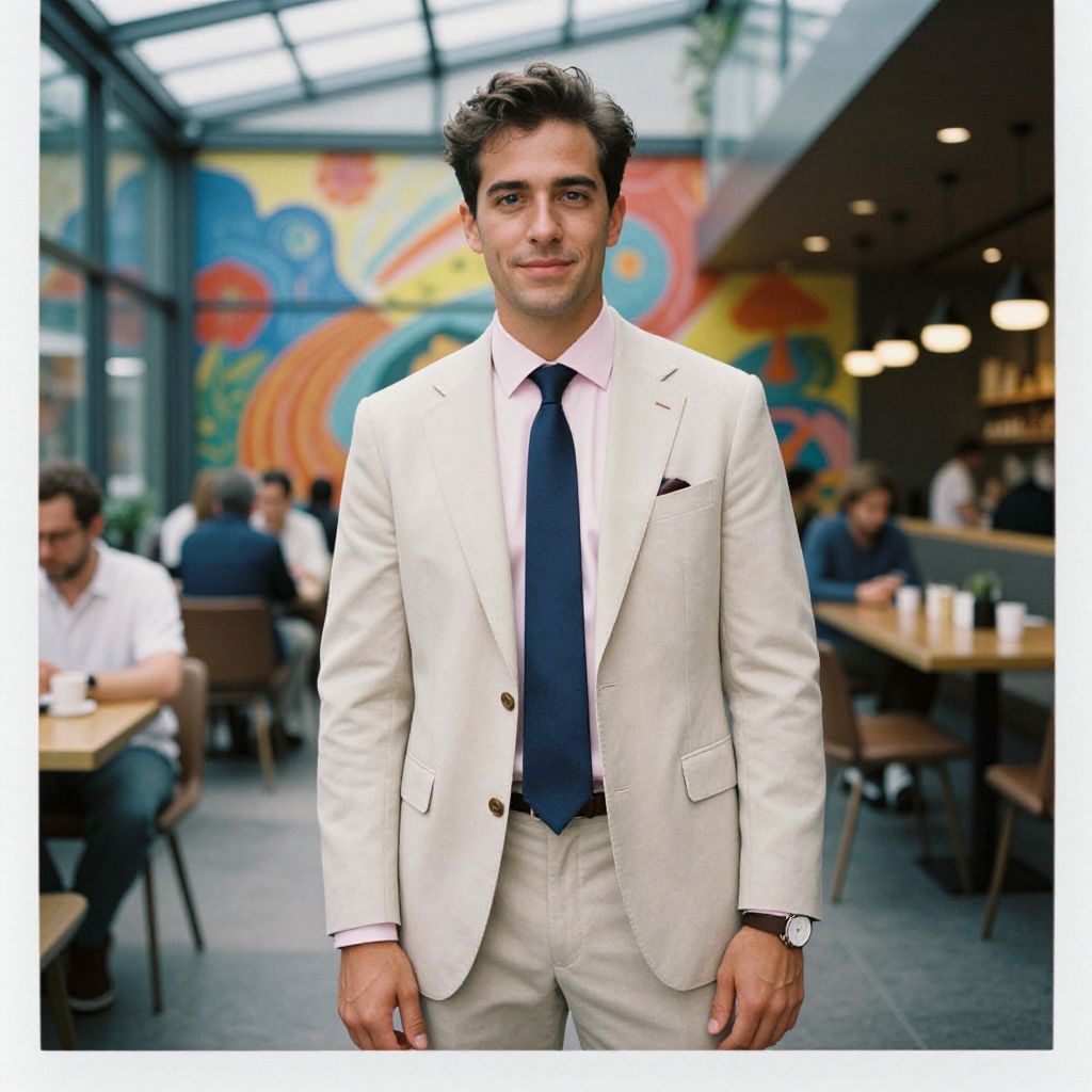 A man, light beige tailored fit suit, soft pink dress shirt, solid navy tie, tan suede loafers, minimalist watch, modern glass atrium, vibrant murals, bustling café, lomography analog photo, confident smile. Man has masculine face and piercing eyes