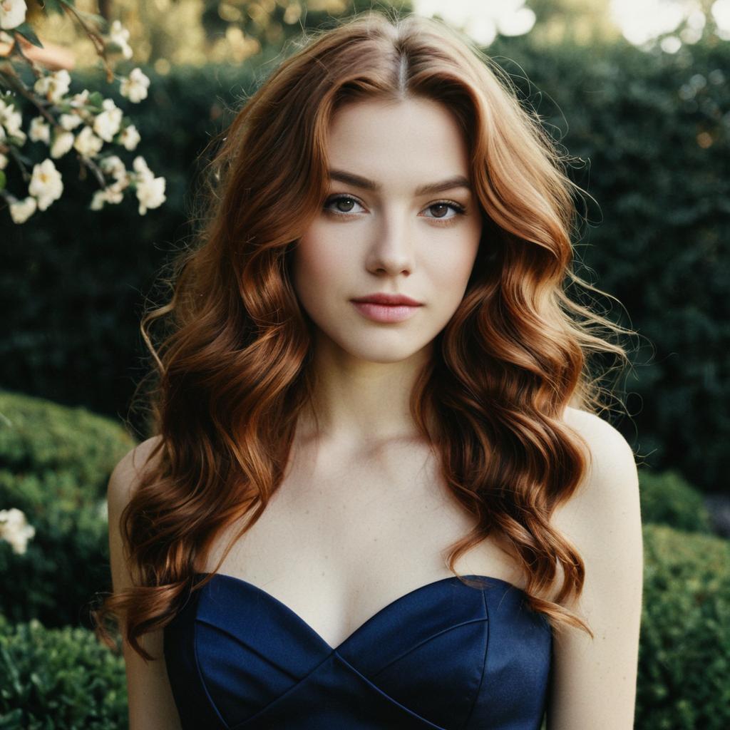 A realistic portrait of a young woman with long wavy auburn hair and striking eyes, wearing a strapless navy blue evening dress, natural morning light accentuating smooth skin texture, warm brown and beige colors, detailed facial features, outdoor garden with soft natural colors