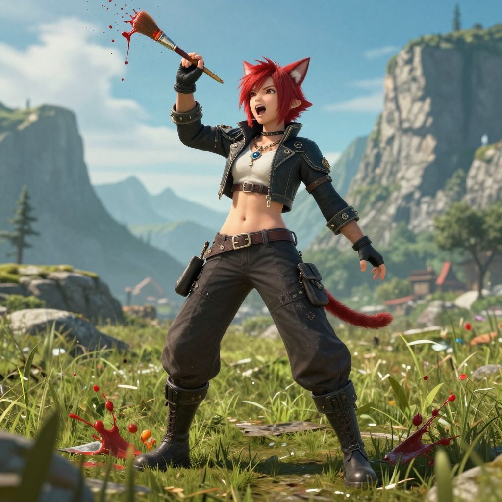 PictomancerFFXIV, 1girl, solo, miqote, cat ears, animal ears, short hair, open mouth, gloves, outdoors, navel, jewelry, jacket, full body, red hair, boots, midriff, belt, pants, fingerless gloves, necklace, paintbrush, paint drip, paint splash, paint splatter, grass, mountains, dynamic pose, cinematic angle, side lighting, cinematic, Onsal Hakkir, PVP mode, FFXIV, masterpiece, best quality, official art