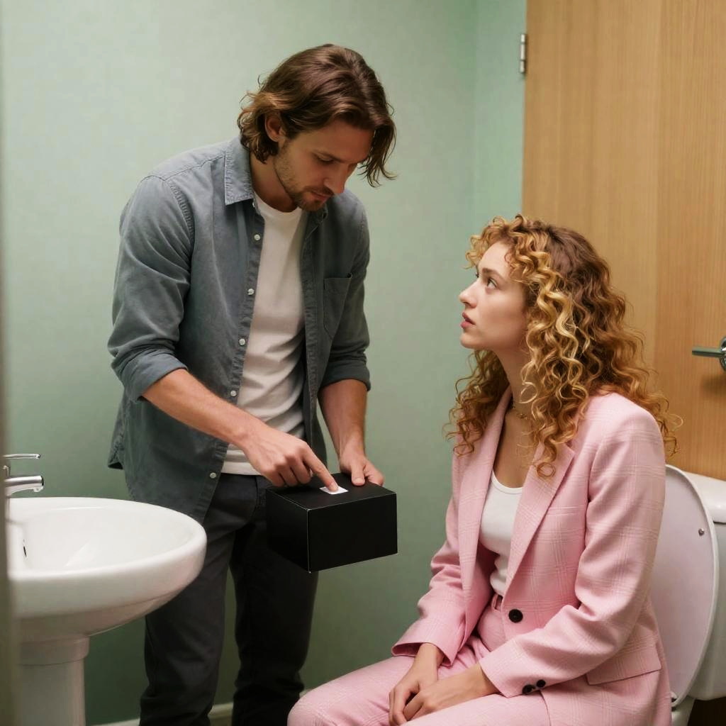 Photograph of two people in a bathroom. A man with long brown hair, wearing a gray shirt over a white tee, leans over a toilet, pointing at a black box. A woman with curly blonde hair, in a pink checkered blazer, sits on the toilet seat, looking at him intently. White sink on the left, green wall in the background, wooden door on the right.