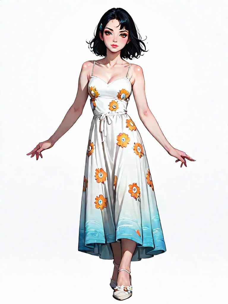 Illustration of a woman wearing an elegant blue sleeveless trapeze dress decorated with pink floral and wave patterns. She has black shoulder-length hair styled in loose waves, oversized sunglasses, layered bracelets, and beige high heels. The woman poses confidently with a flared hem dress, standing against a pastel circular background and stylized water splash effects, evoking a bohemian, beachy aesthetic.