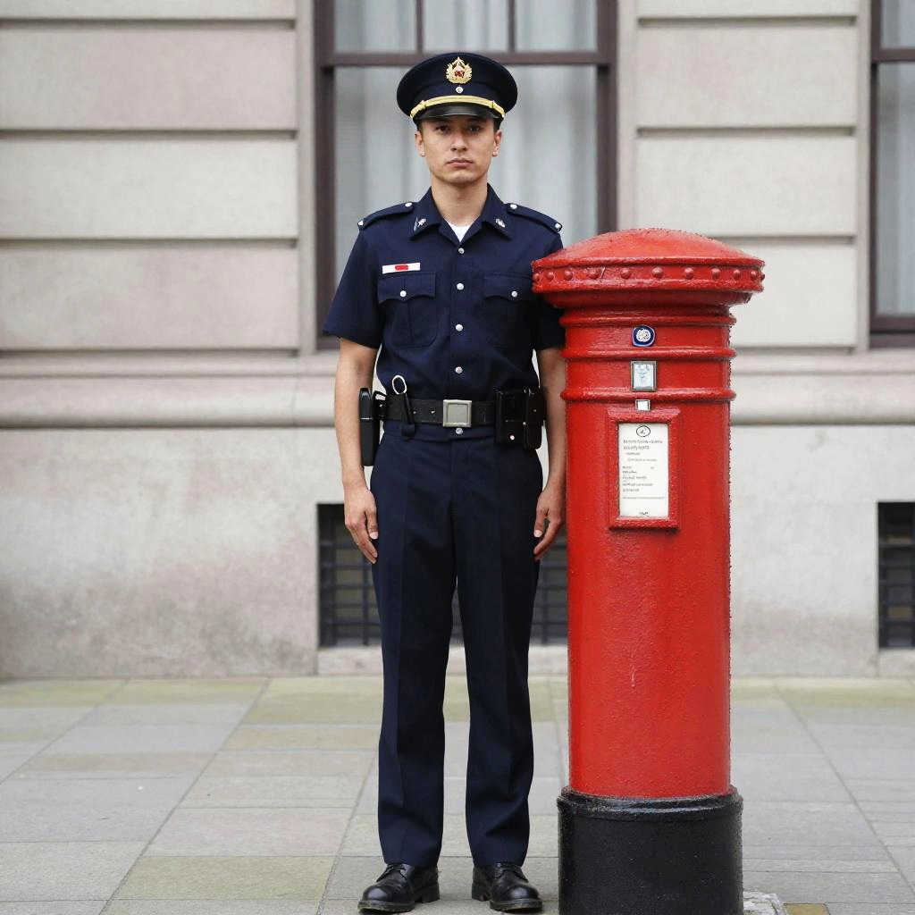 Photograph of a stern British male postal officer in dark uniform with gold chains, standing beside a bright red postbox, in front of a beige stone