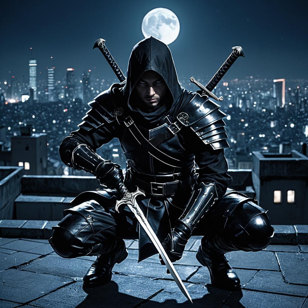 A crouching assassin dressed in stealthy black leather armor with metal shoulder and arm guards, holding a sharp sword with two swords crossed on his back. The scene is set on a rooftop at night with a full moon illuminating the figure, overlooking a shadowy cityscape filled with tall buildings and lights. The assassin has a focused and intense expression, wearing a hood that partially shadows his face.