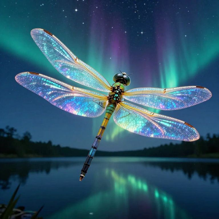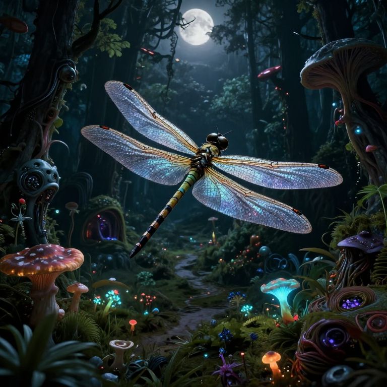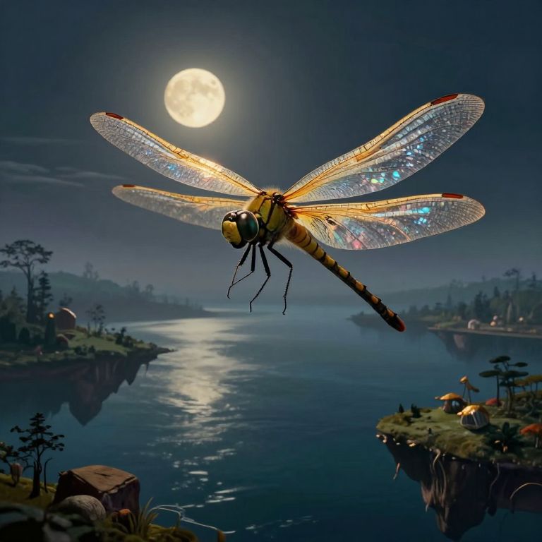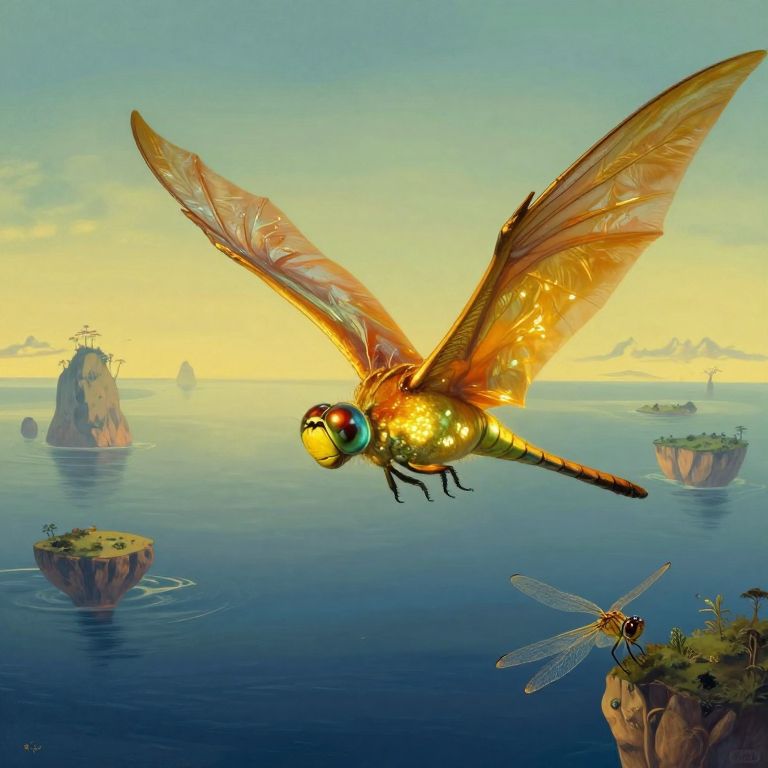 Imagine a mesmerizing digital art composition evoking the surreal essence of Dali's dreamscape, depicting a tranquil nocturnal scene with floating islands suspended in midair. From an aerial viewpoint, witness a majestic dragonfly hovering above a mystical, misty lake, its iridescent wings reflecting the soft luminescence from a distant full moon. The scene is bathed in warm, golden lights emitted by the dragonfly's presence, creating a captivating interplay of light and shadow that accentuates the dreamlike quality of the image.