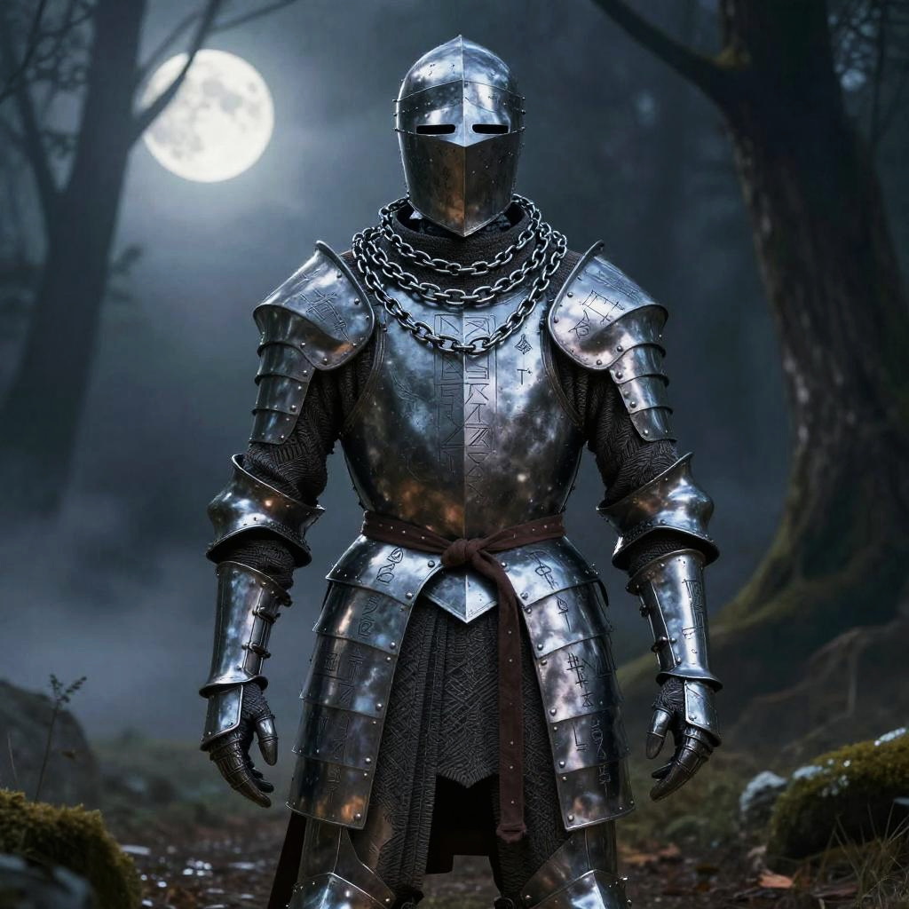 Dnd chain armor gleaming under moonlight, intricate metal links interwoven with ancient runes, worn by a medieval warrior in a misty forest clearing, vivid fantasy style