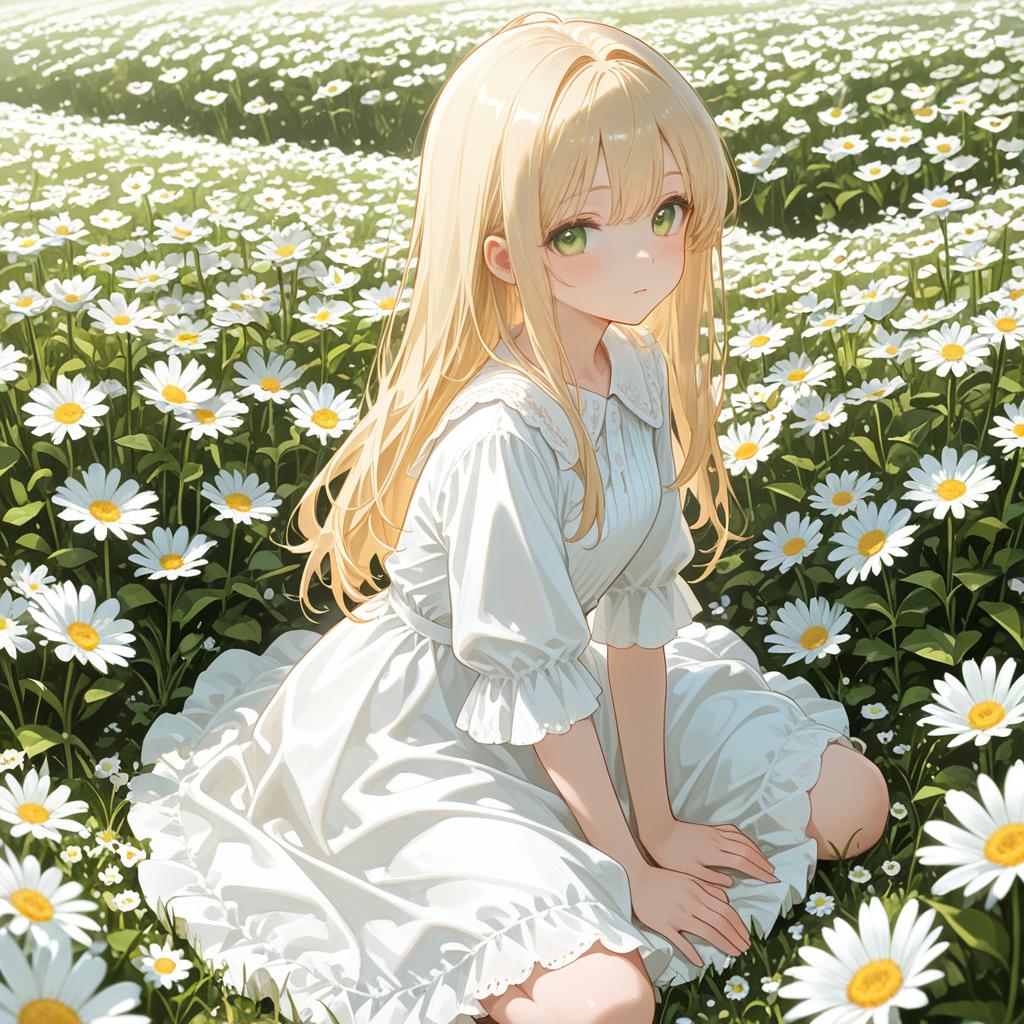 1girl, in a field of flowers, white flower, looking at viewer, blue eyes, blonde hair, daisy, long hair, pure white dress