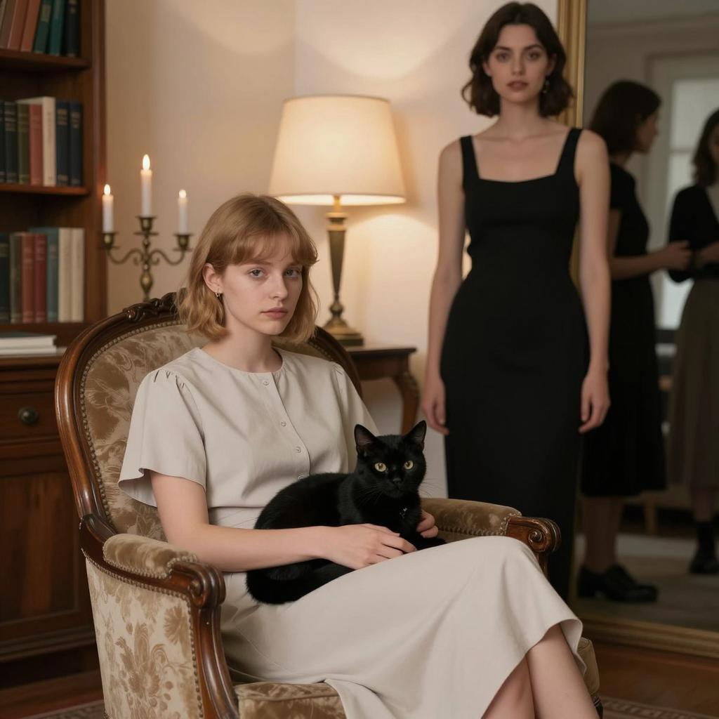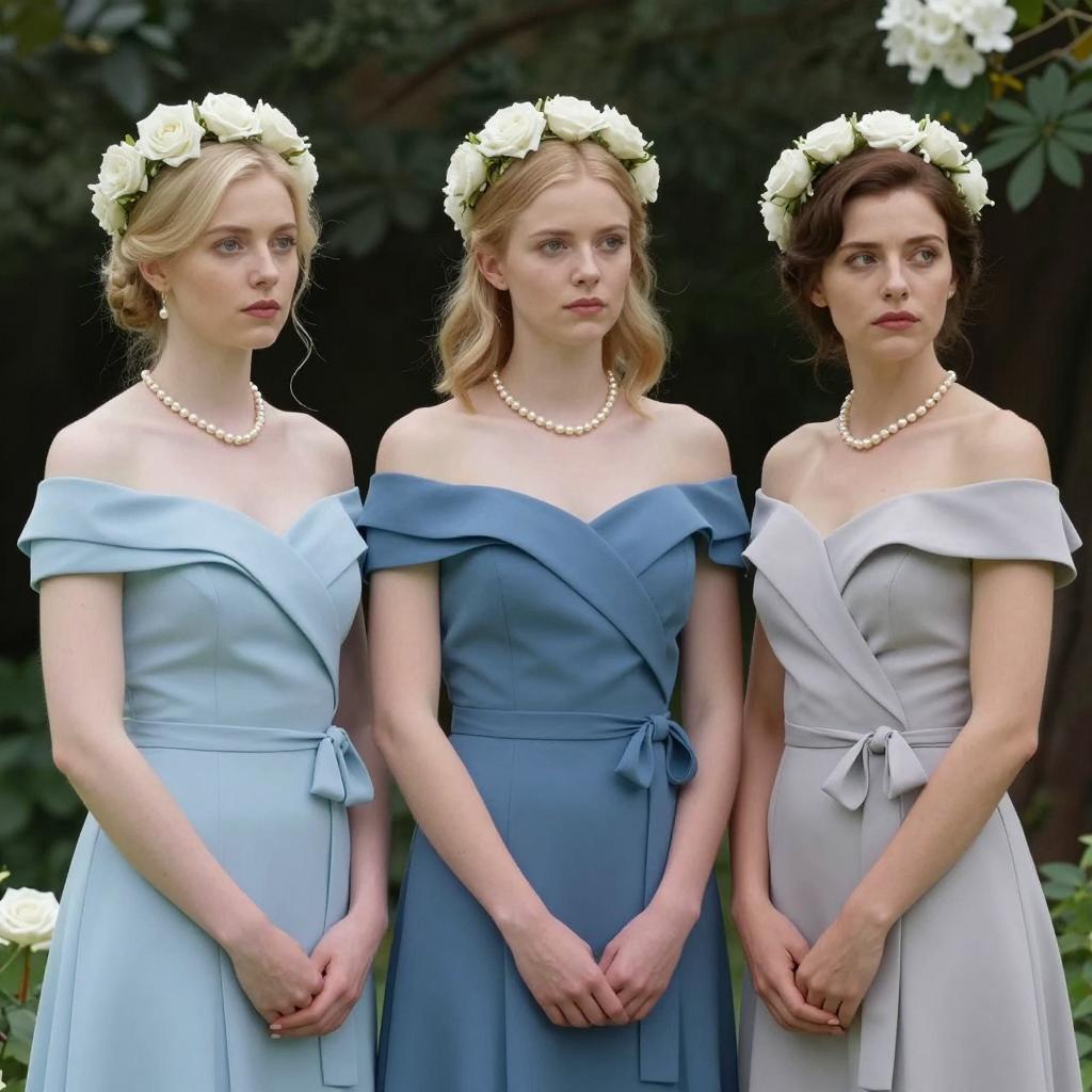 Three women in formal dresses, standing side by side. All have floral headpieces and pearl necklaces. Blonde woman in center wears blue dress, middle woman in light blue dress, right woman in light gray dress. Background has dark green foliage with white flowers. Women have intense expressions, looking to the right. Blonde hair in updo, middle hair shoulder-length, right hair in bun. Light blue and gray dresses have off-the-shoulder styles. White roses in hands. Illuminated by soft light.