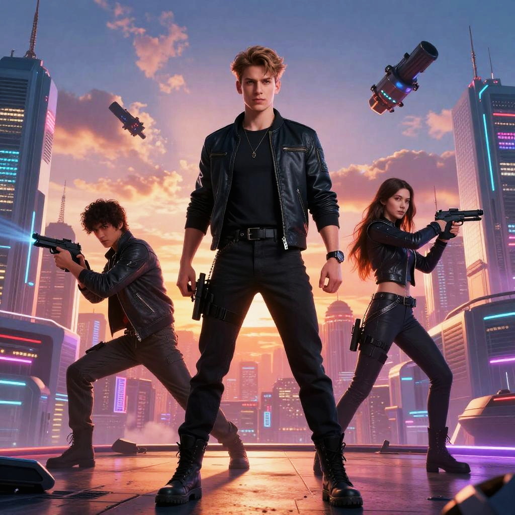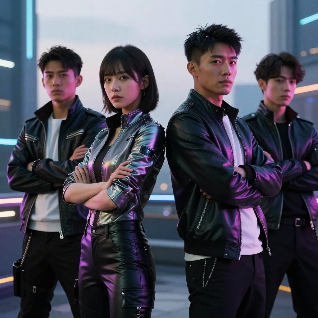 Fringe Asian men portrayed as futuristic cyberpunk warriors, neon-lit urban environment, high contrast lighting, detailed cybernetic enhancements, atmospheric fog.
