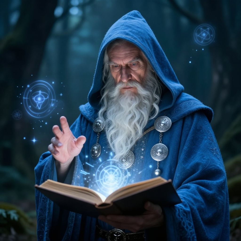 An elderly wizard with a long white beard and blue robe is casting a magical spell from an open book. The wizard is wearing a hooded cloak adorned with intricate silver designs and medallions, surrounded by glowing mystical symbols and magical light effects in a dark, enchanted forest setting.