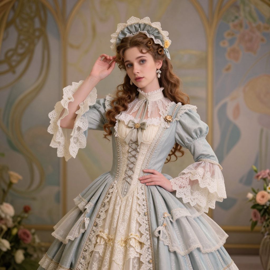 Duchess Alice in Wonderland costume, detailed vintage dress with layers of lace and ruffles, soft pastel palette with floral embroidery, in a surreal tea party scene with oversized clocks, teapots, and smiling Cheshire Cat eyes in the background