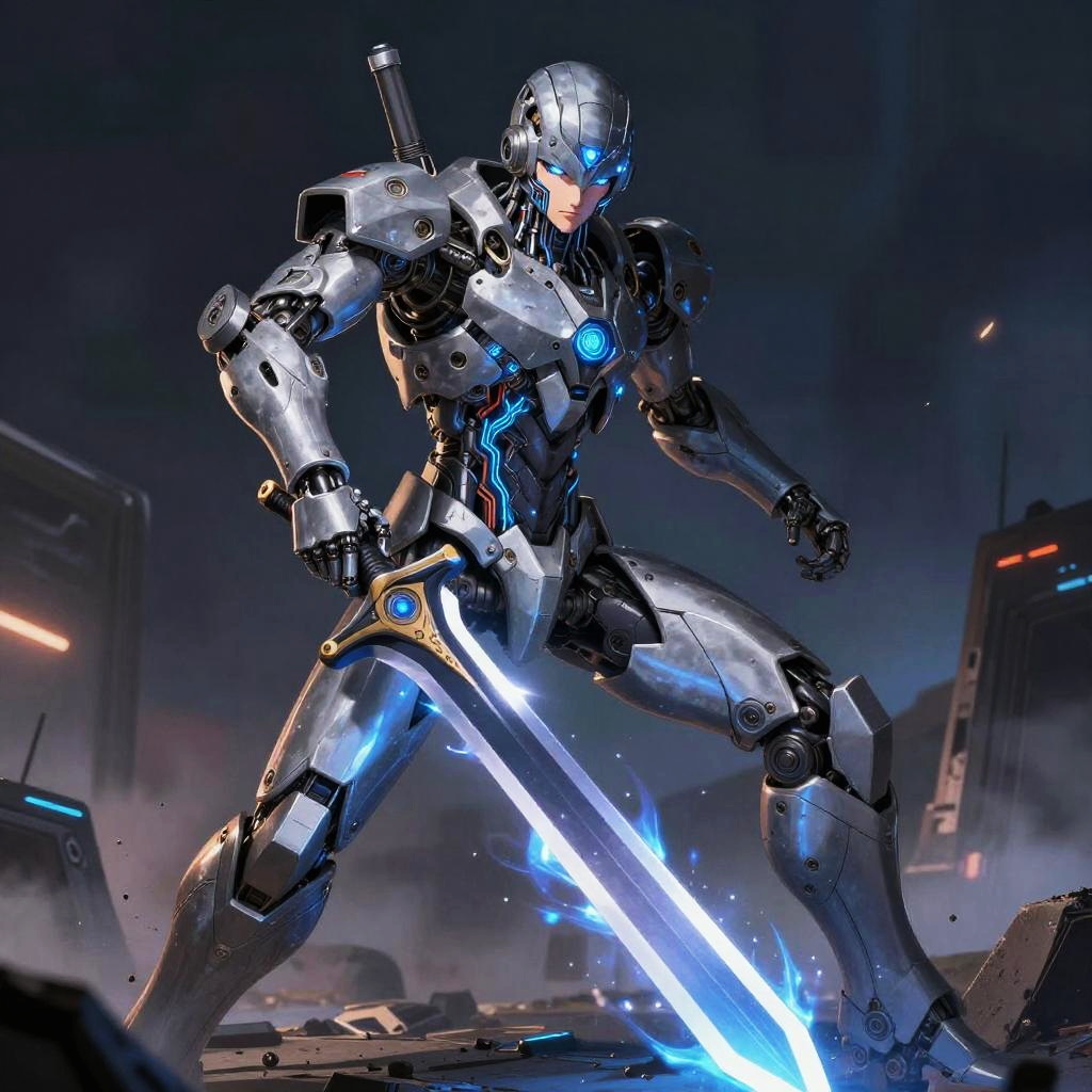Anime cyborg warrior wielding energy sword, battle-ready stance, half-human half-robot face, glowing circuits, futuristic battlefield, dramatic lighting, highly detailed mechanical design