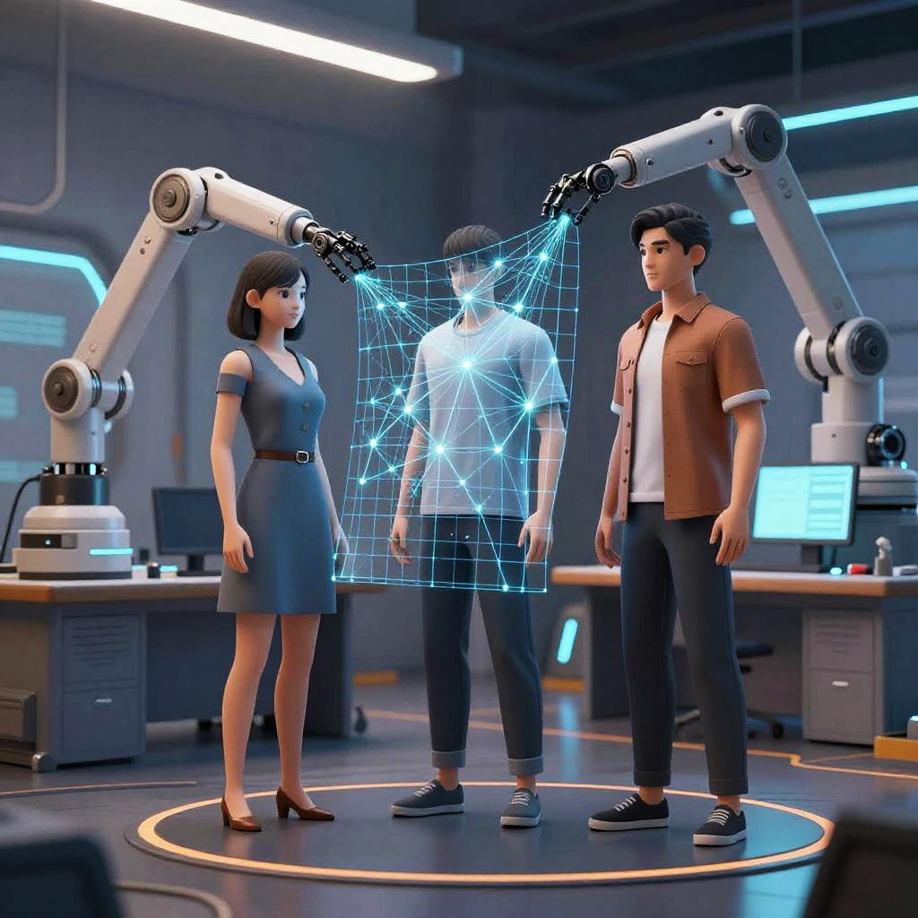 Clothes remove AI concept art featuring robotic arms and neural network grids efficiently stripping virtual clothing on realistic 3D character models, futuristic workspace, neon accents, crisp digital illustration.
