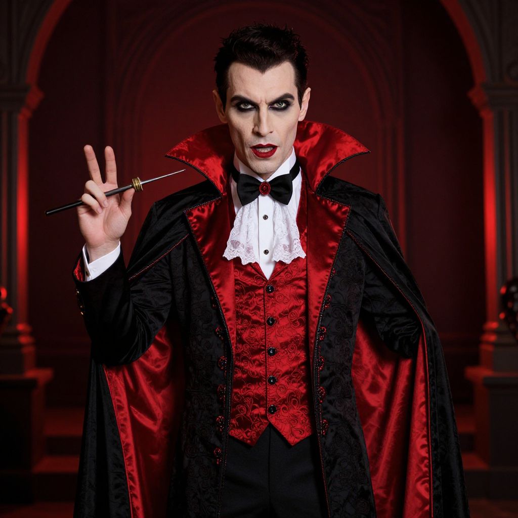 This striking image features a man dressed in an elaborate vampire costume, showcasing a blend of gothic elegance with rich red and black hues. The dramatic setting enhances the overall theme, reminiscent of classic vampire lore and cinematic portrayals of the undead, making it perfect for Halloween or themed events.