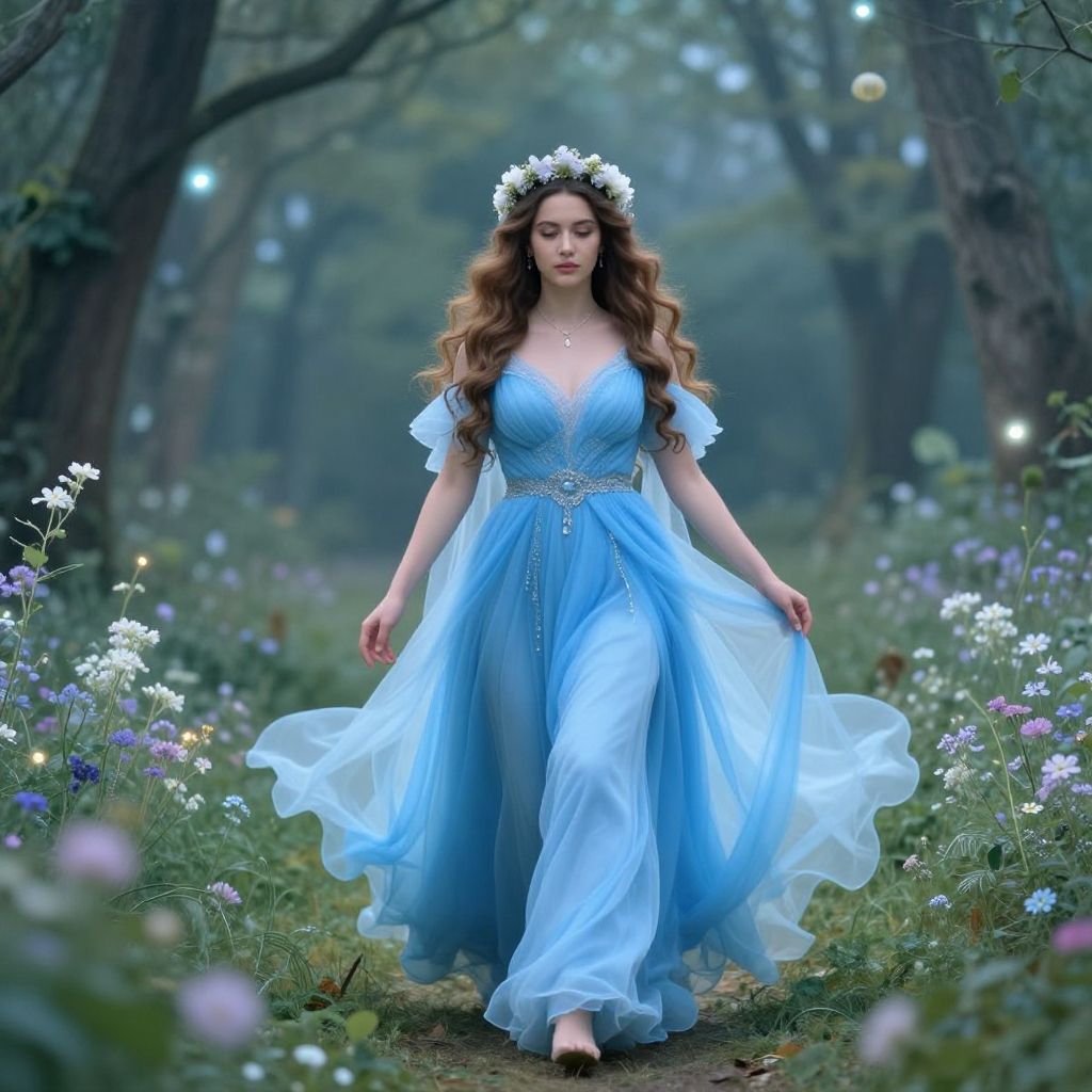 A mystical woman adorned in a flowing blue gown walks gracefully through an enchanted forest, surrounded by ethereal light and delicate flowers. Her long, wavy hair, complemented by a floral crown, adds to the enchanting and dreamlike atmosphere of the scene.