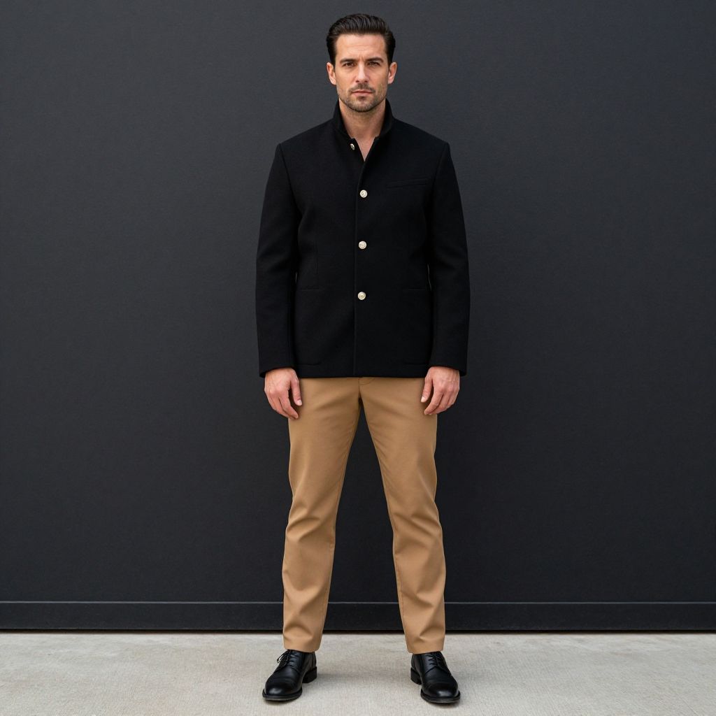 Photograph of a handsome man with short dark hair and light beard, wearing a black button-up jacket, beige pants, and black shoes, standing against