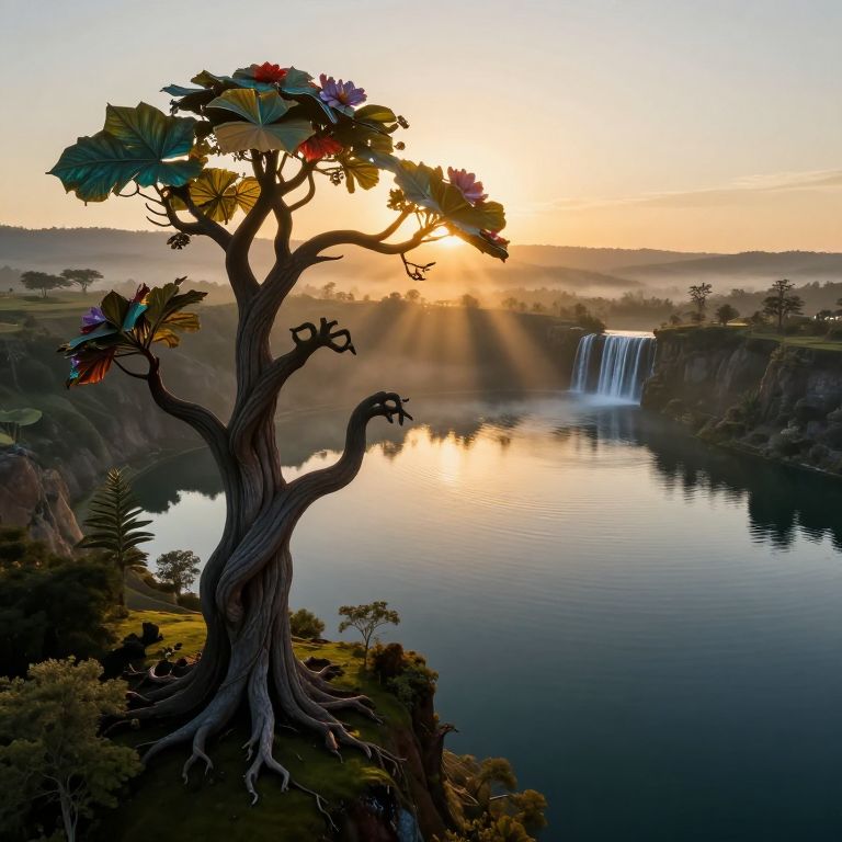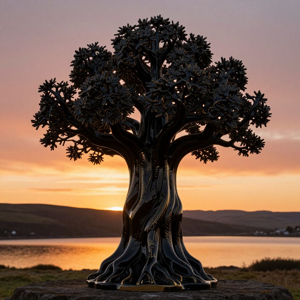 A golden hour scene features a black porcelain sculpture of a woman intertwined with a tree, evoking the image of Yggdrasil.