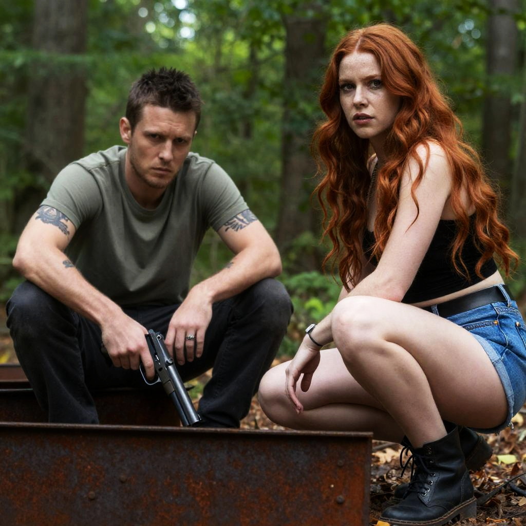 Photograph of two people in a forest. Man with short dark hair, green shirt, tattoos, holding gun, sitting. Woman with long red hair, topless, denim shorts, crouching. Rusty metal objects, green foliage, sunlight, intense expressions.
