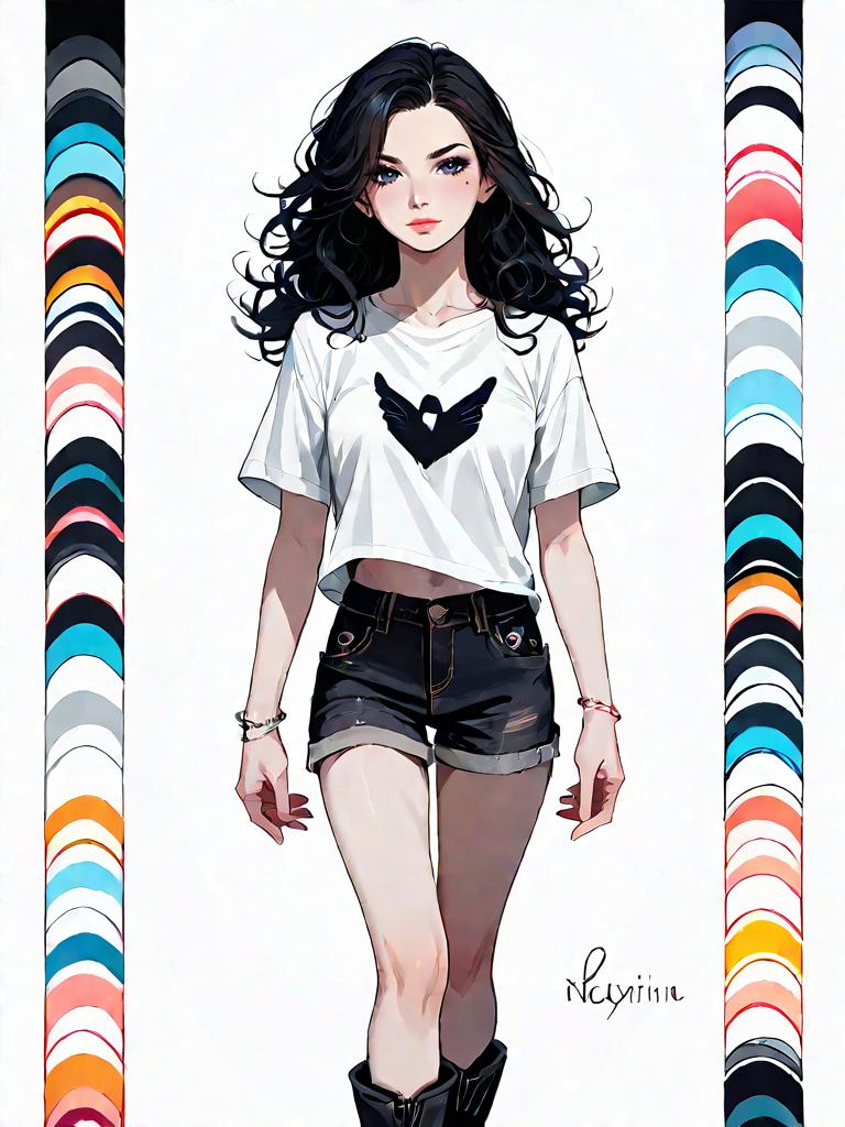 1girl, source_comics, realistic face, full body shot, Woman, casual chic, plain white t-shirt, crew neck, short sleeves, black lace-trimmed shorts, mid-thigh length, black ankle boots with low heel, minimalist silver bracelet, natural curly hairstyle, simple studio background