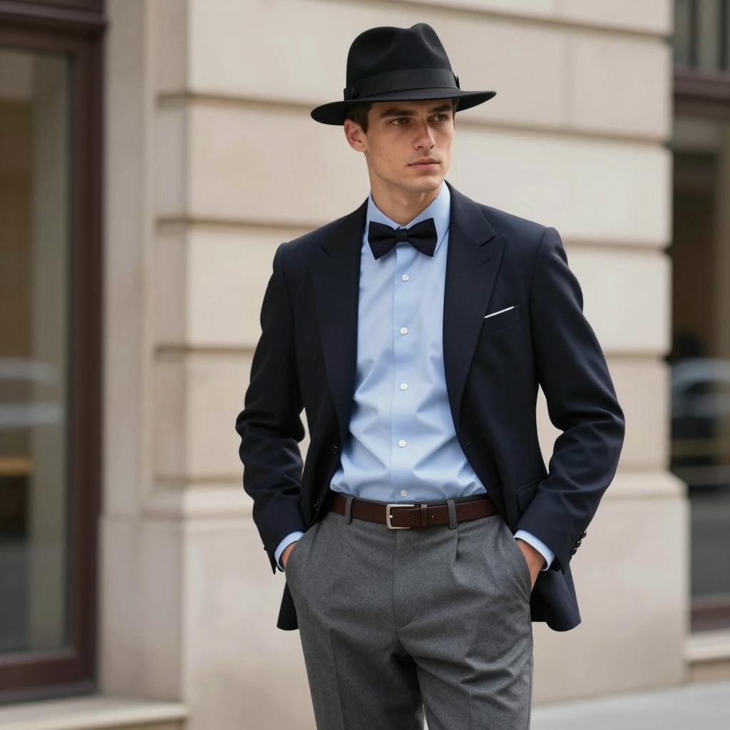Austin powers man fancy, photograph of a young man, standing, wearing vintage orange brown suit, pink bow tie, pink shirt, white cuffs, green pocket square, black-framed glasses, brown hair, stone wall background, daytime, street setting, retro fashion, stylish, detailed ures