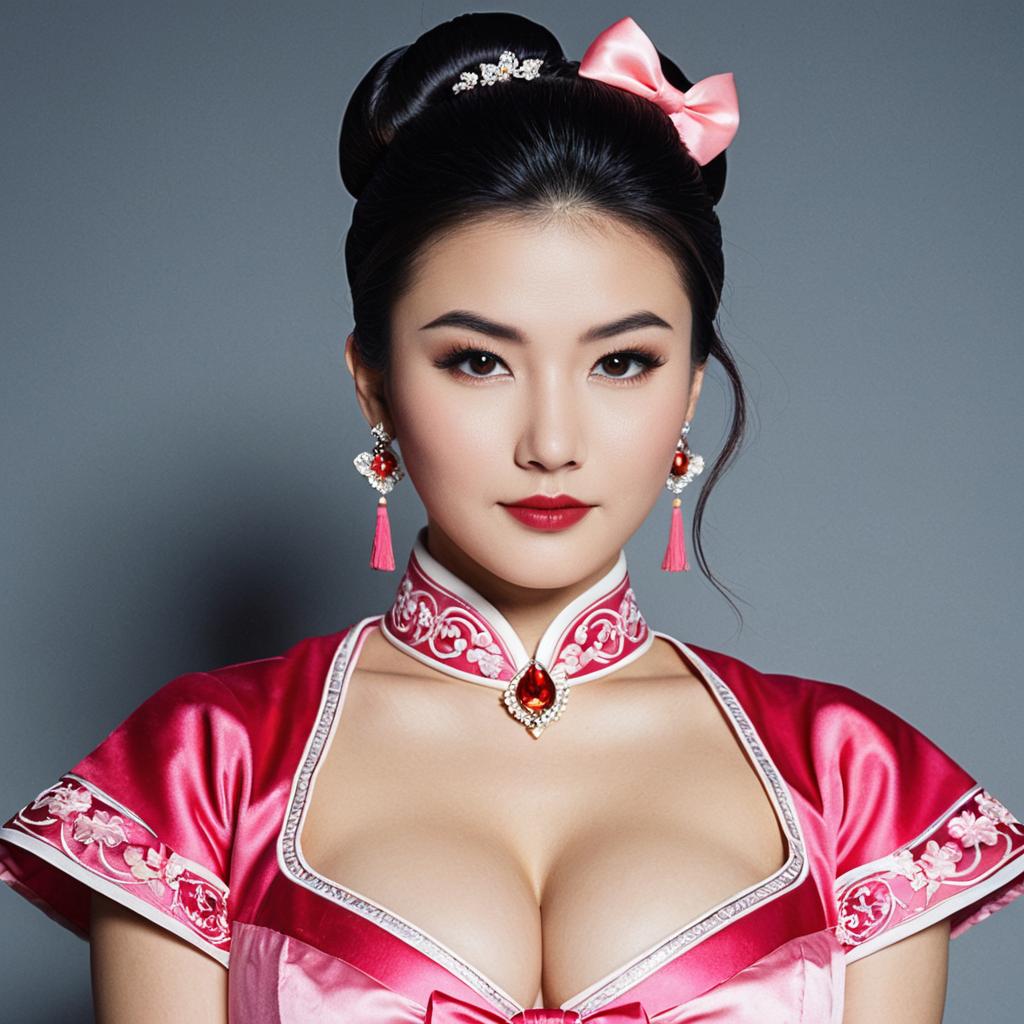 Portrait of an elegant young Asian woman wearing a pink traditional Chinese dress with floral embroidery and a cleavage cutout. She has her hair styled in a single bun adorned with a pink bow and delicate hair accessory. She wears matching pink and red tassel earrings with a jeweled necklace, complemented by makeup featuring red lipstick and well-defined eyebrows. The image is a close-up of the upper body against a neutral gray background.