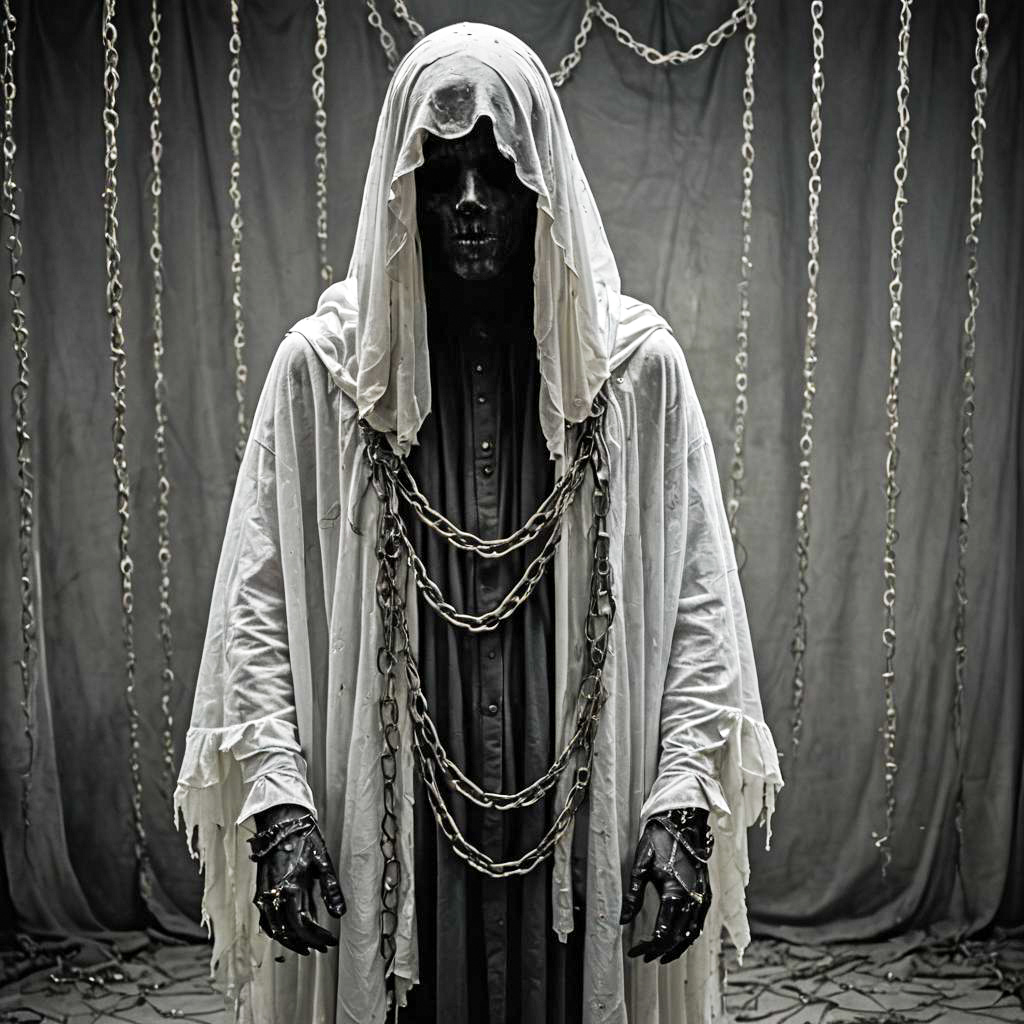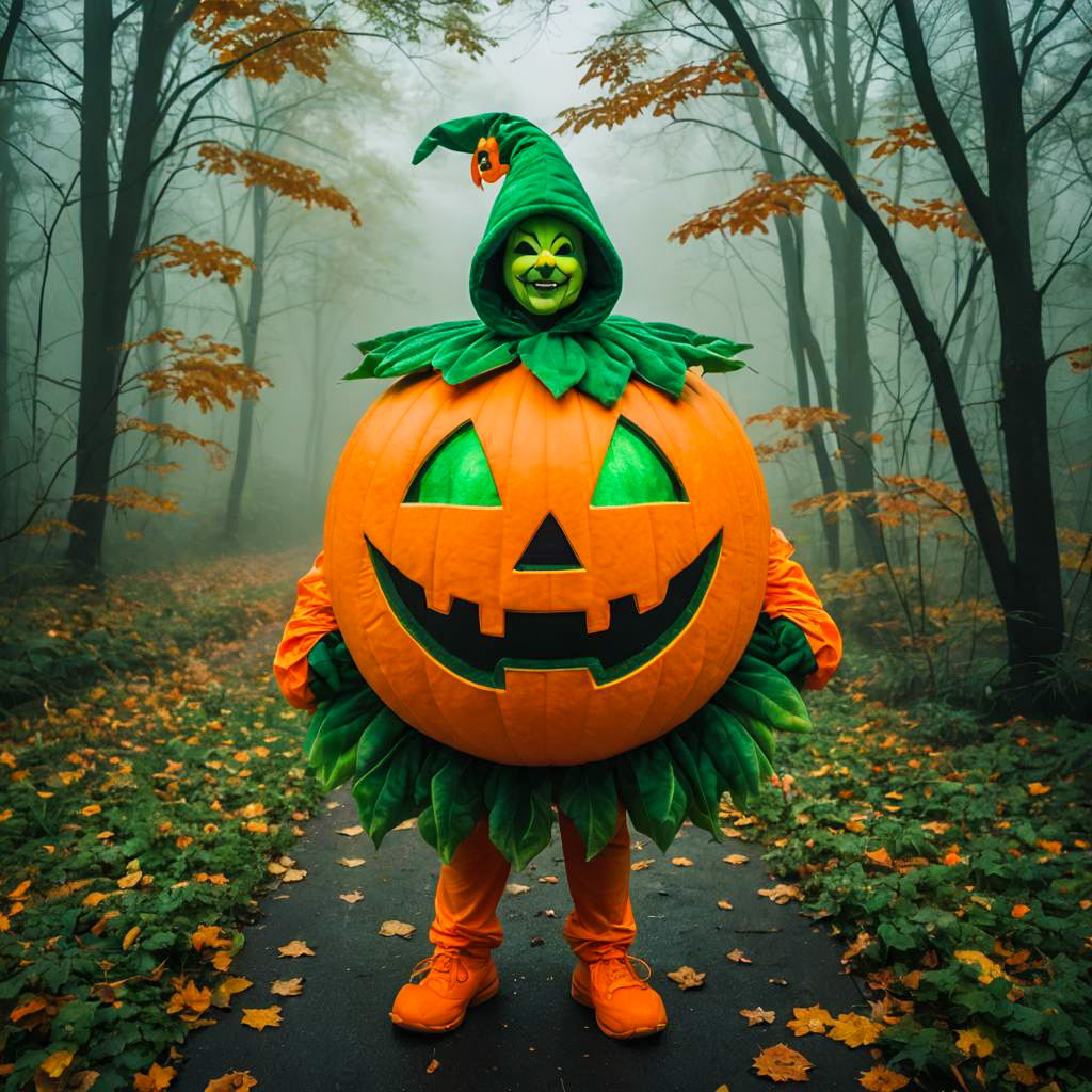Halloween outfit, worn by cheerful pumpkin mascot, featuring oversized pumpkin costume with leafy accents, in vibrant orange and leafy green, captured in spooky foggy atmosphere.
