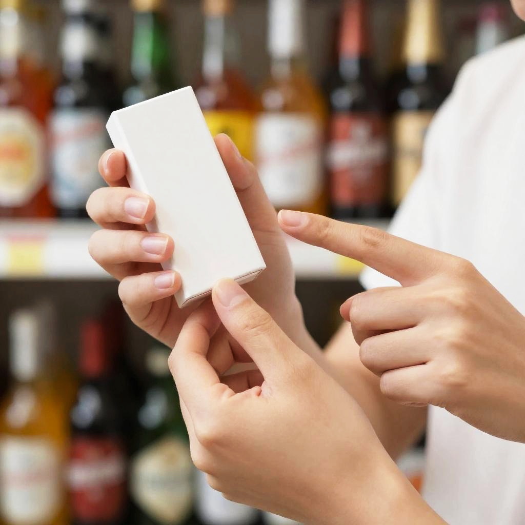 A close-up photograph shows two hands, one holding a white rectangular object and the other pointing at it. The background is slightly blurred, featuring colorful bottles. The hands have light skin and neatly trimmed nails. The person wearing a white shirt is partially visible on the right. The image has a bright, colorful, and slightly abstract feel.