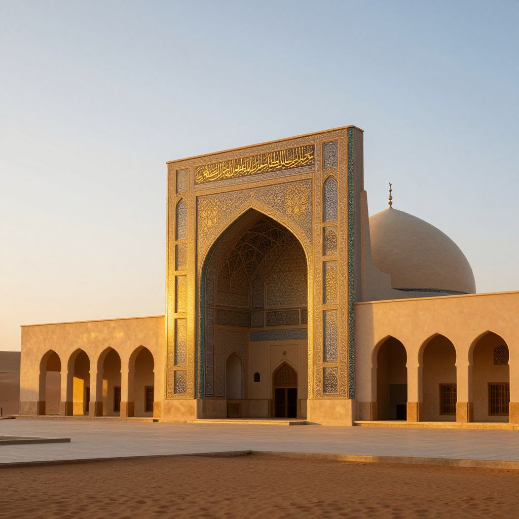 Islamic prompt: A serene and elegant mosque at sunrise, with golden light filtering through intricate arches and calligraphy inscribed in flowing Arabic script, blending traditional Islamic architecture with modern minimalism in a peaceful desert landscape.