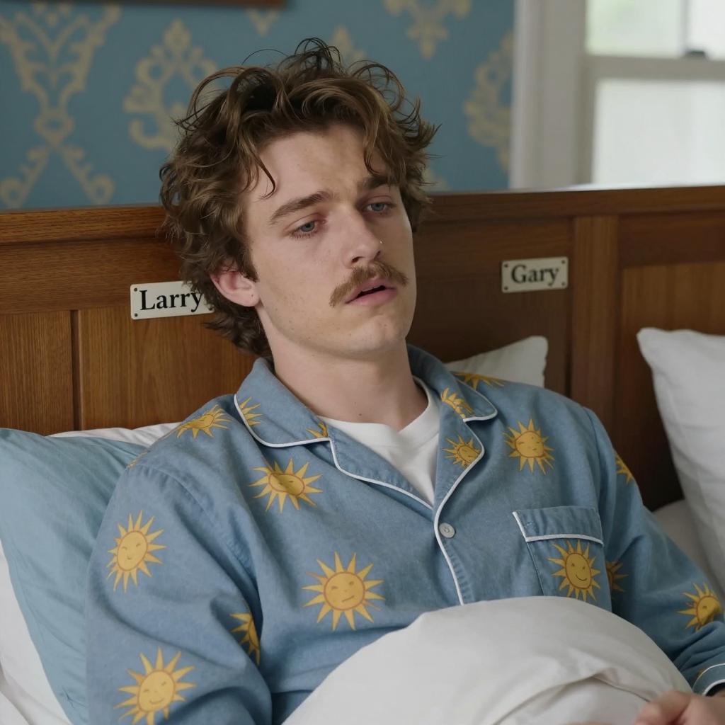 A young man with disheveled brown hair and a thin mustache is sitting in a wooden bed with multiple headboards labeled 'Larry' and 'Gary.' He wears a blue pajama top decorated with yellow sun patterns over a white shirt. The bed has blue and white pillows, and the background features blue patterned wallpaper and a window. The man appears tired with his mouth slightly open and blue eyes looking forward.