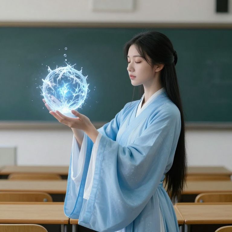 Asian woman in light blue kimono creates glowing blue orb with outstretched hands in empty classroom with wooden desks. Photorealistic digital art.
