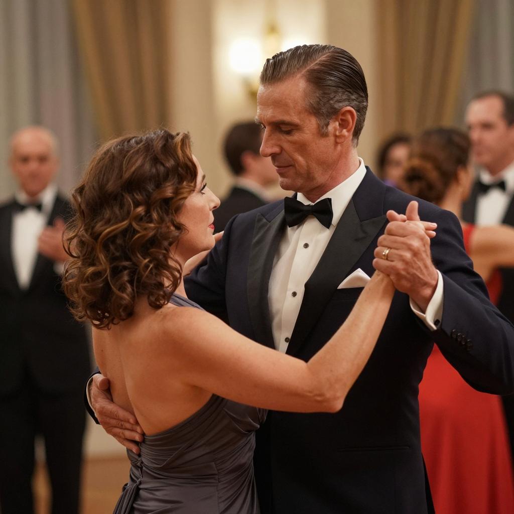 A man and woman dancing in an elegant ballroom. The man in a dark suit and bow tie, with short, slicked-back hair, faces the woman. She has wavy, shoulder-length hair, wears a sleeveless, draped dress, and gazes up at him. Several people in the background, blurred, create a lively atmosphere. The man has a small, folded handkerchief in his breast pocket. Intense expressions are not visible.