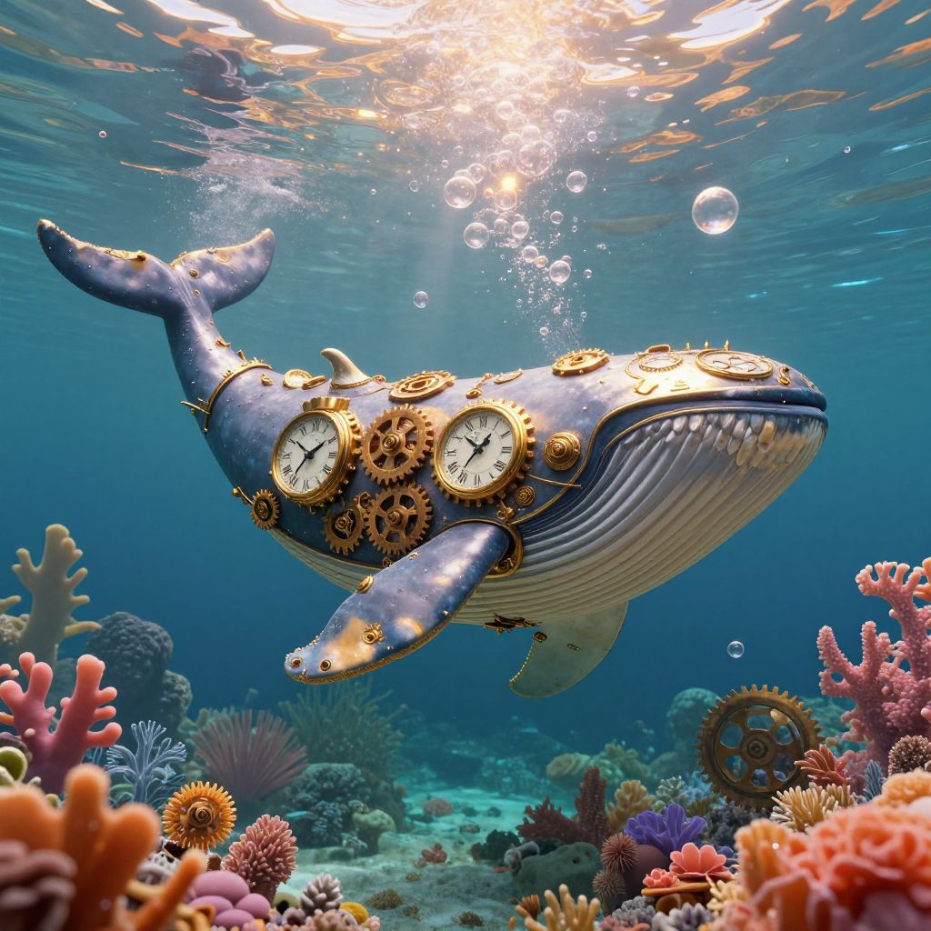 Envision an underwater tableau echoing Japanese ukiyo-e woodblock artistry, showcasing the serene splendor of marine life harmoniously intertwining with a fantastical steampunk world. A regal, elongated seahorse gracefully navigates the depths, its shimmering scales adorned with interlocking clockwork components and gleaming brass fixtures that effortlessly blend with its aquatic surroundings. Soft, dreamlike illumination emanates from the coral formations, casting delicate shadows upon the captivating fusion of organic beauty and mechanical elegance, instilling a sense of awe and appreciation for the symbiotic relationship between nature's wonders and mankind's inventive spirit.