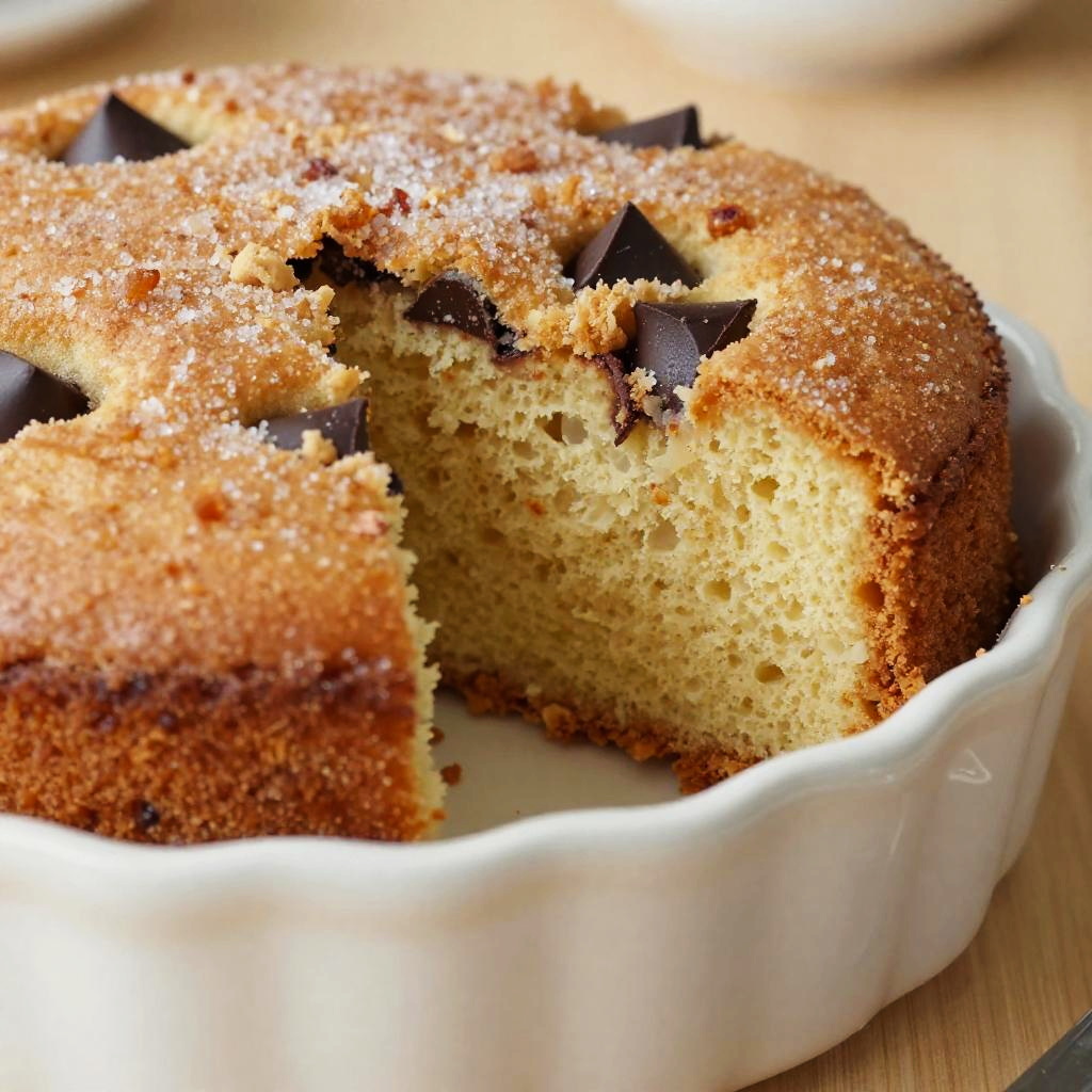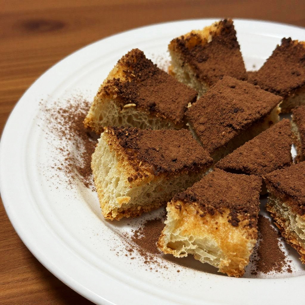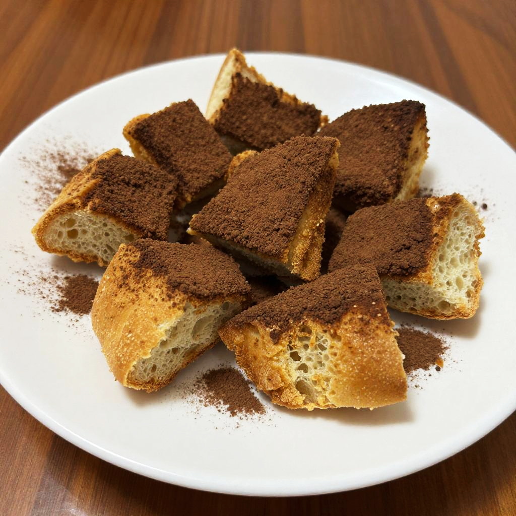 Close-up photo of a white plate filled with crumbled, golden-brown, cinnamon-spiced bread pieces dusted with cocoa powder. The cocoa powder creates a brownish trail on the plate. The background features a wooden table with a reddish-brown grain pattern, adding warmth to the image. The bread looks soft and slightly crispy, with a textured, homemade appearance.