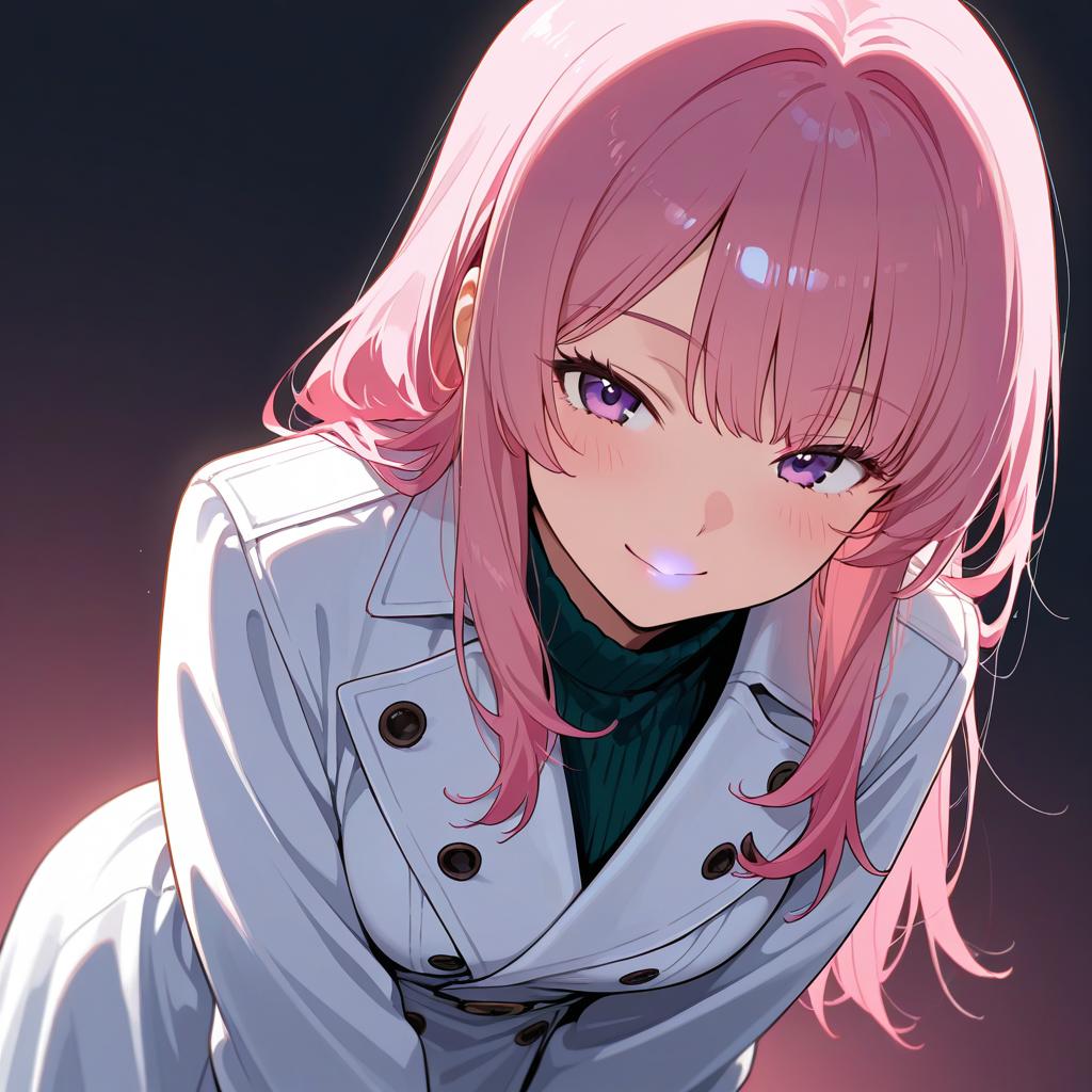 Masterpiece, best quality, 1girl, leaning forward coat pink hair shadow dramatic lighting Georgeana Ireland matrix, smile