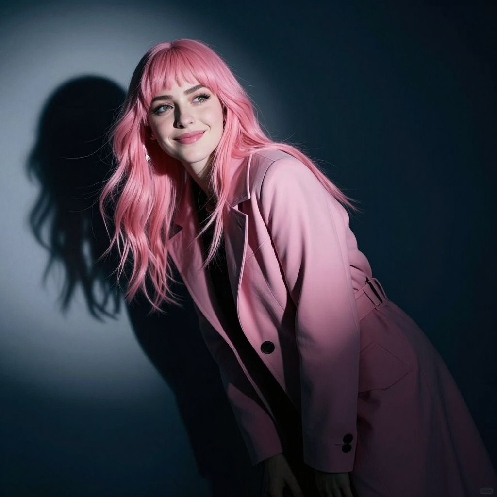 Photograph of a woman with pink hair, illuminated from the side, wearing a dark coat, against a black background, creating a dramatic, high-