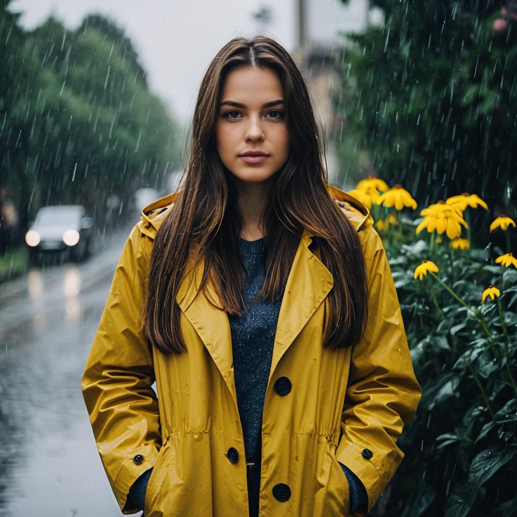 Portrait of a young woman with long brown hair and brown eyes standing outdoors on a rainy day. She is wearing a yellow raincoat with her hands in the pockets. The background is blurred with green foliage and yellow flowers, and raindrops are visible.
