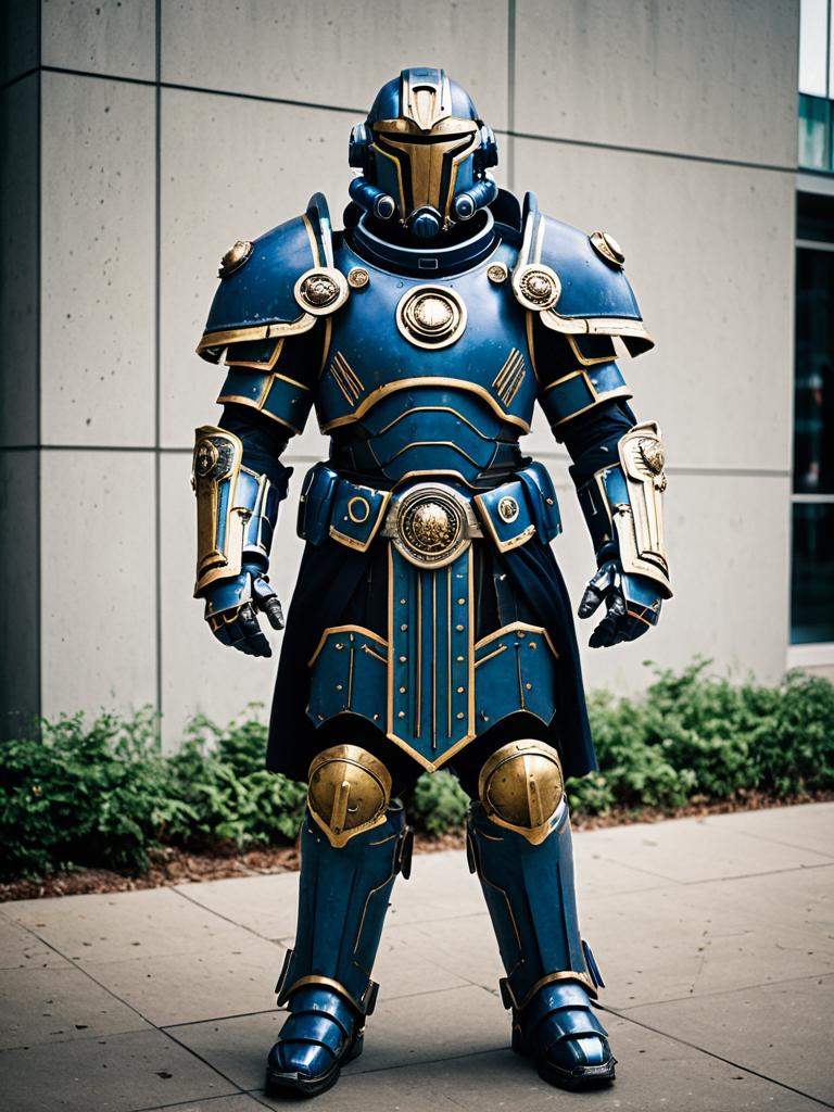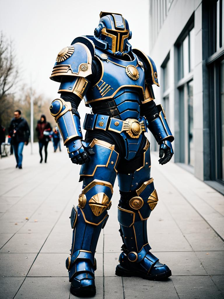 Photo-realistic cosplay of a person wearing a detailed Adeptus Astartes power armor costume. The full body armor includes a helmet, pauldrons, gauntlets, and intricate blue and gold plating. The costume features ornate embellishments and a futuristic design, photographed outdoors against a modern concrete and glass building backdrop.