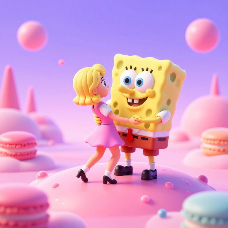 Sponge dreamcore sci-if landscape on a vaporwave macaron planet, neon pastel color scheme, attractive blonde couple slow-dancing, in a sugar universe, 3d, meticulous detailing, photorealistic,