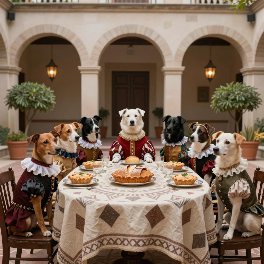A group of six dogs dressed in elaborate Renaissance-style clothing seated at a round table with a geometric pattern. The setting is a courtyard with classical arches, potted plants, and hanging lanterns. Various pies and a large bread are placed on the table, creating an atmosphere reminiscent of a historical banquet.