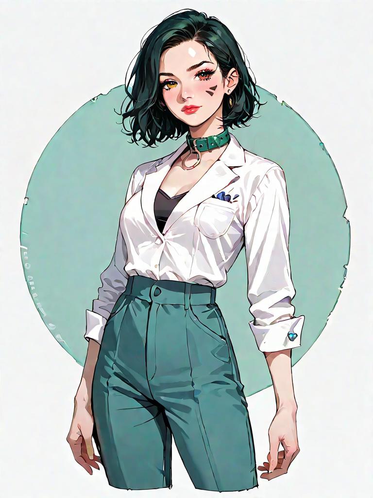 1girl, source_comics, realistic face, full body shot, Woman, business casual, olive green suit, single-button blazer, notched lapels, slim-fit design, matching straight-leg trousers, crisp white blouse, collar slightly exposed, plain background.