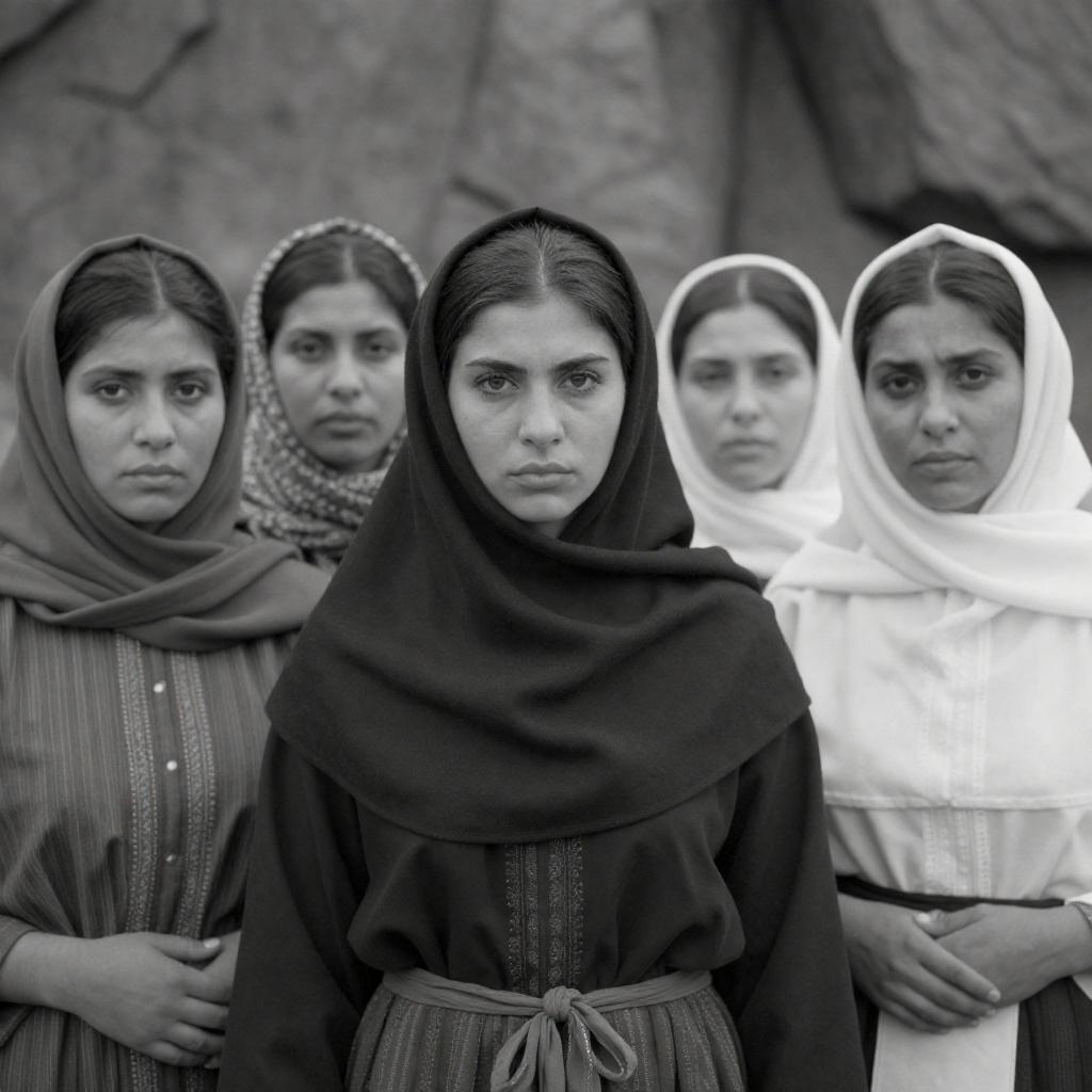 Black and white photo of five women standing close together against a rocky background. All women wear traditional dresses with embroidered details and different styles of head coverings including veils and headscarves in dark, patterned, and plain fabrics. The central woman has a serious expression while the others appear neutral. The image captures cultural attire and strong expressions in a natural outdoor setting.